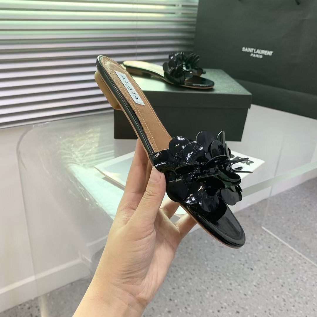Alaia 25 Flower Slippers Glossy Black Sheepskin 293160
