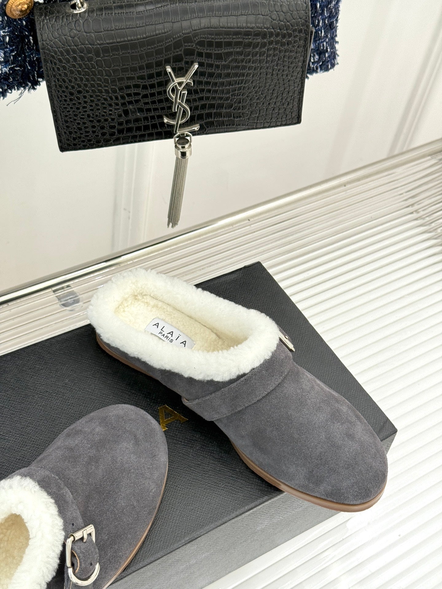 Alaia 25WF slippers belt buckle charcoal grey suede wool 472230