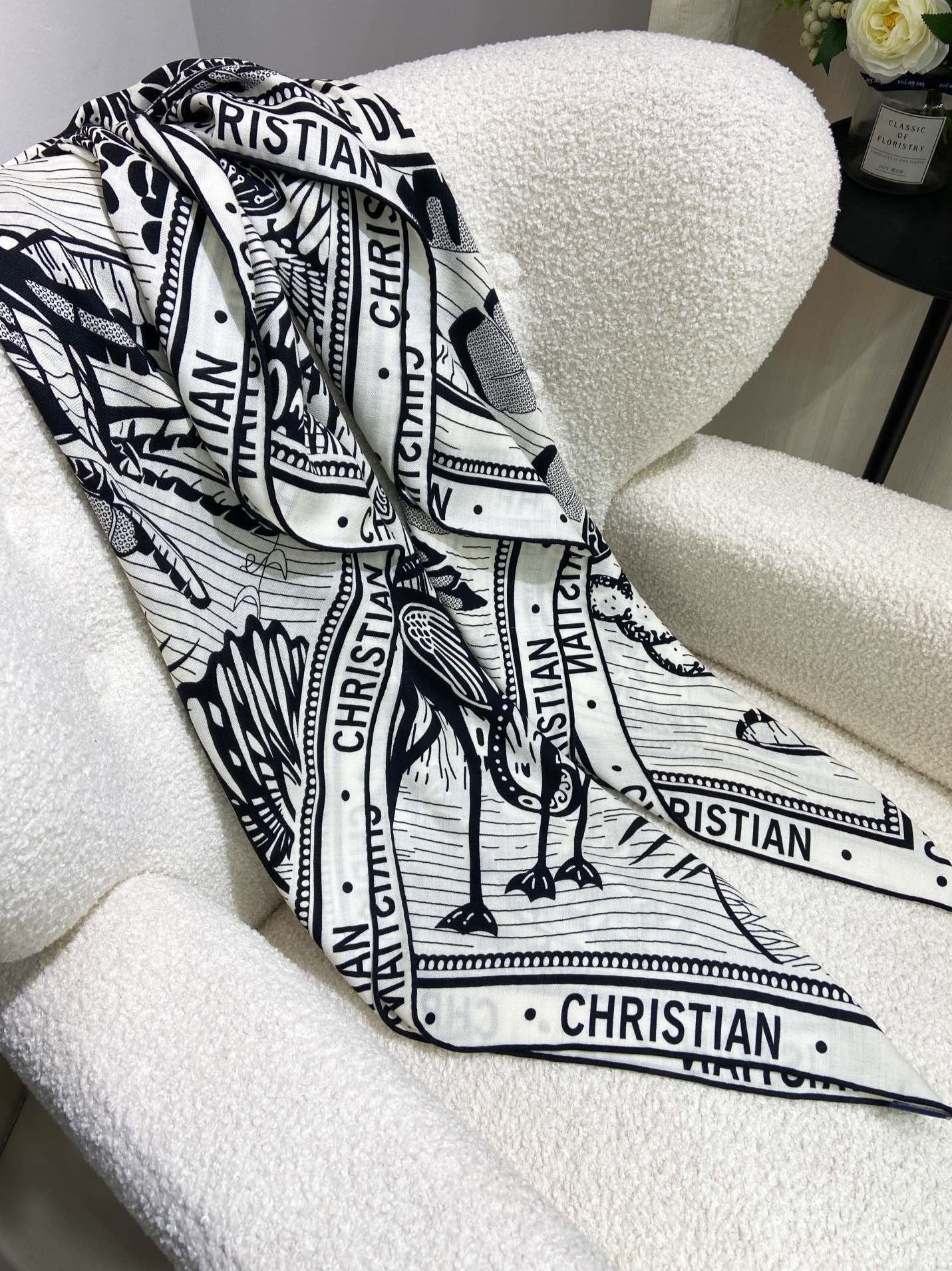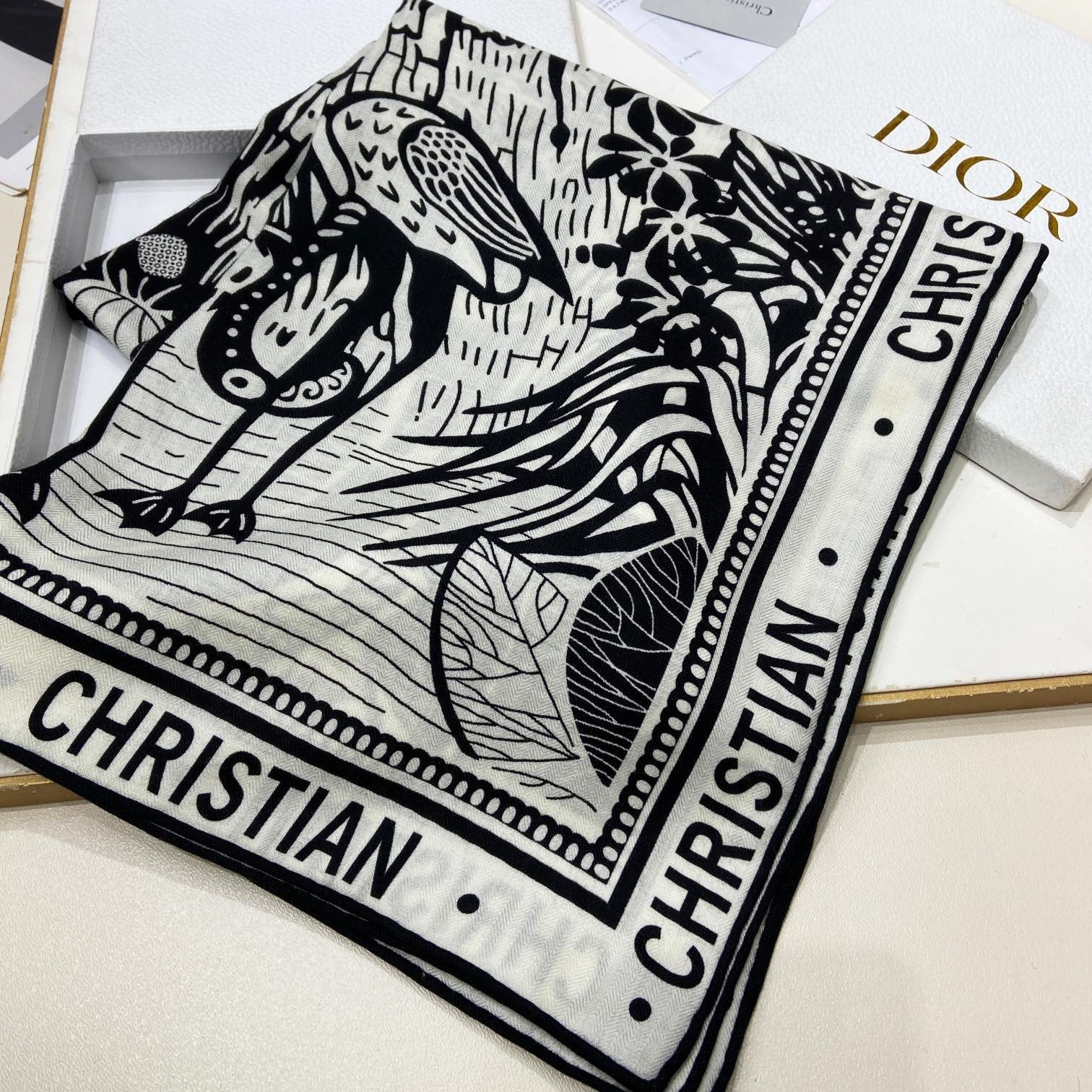 SQUARE SCARF 140 CM IN BLACK MIX WHITE MONOGRAM WOOL AND SILK 415111