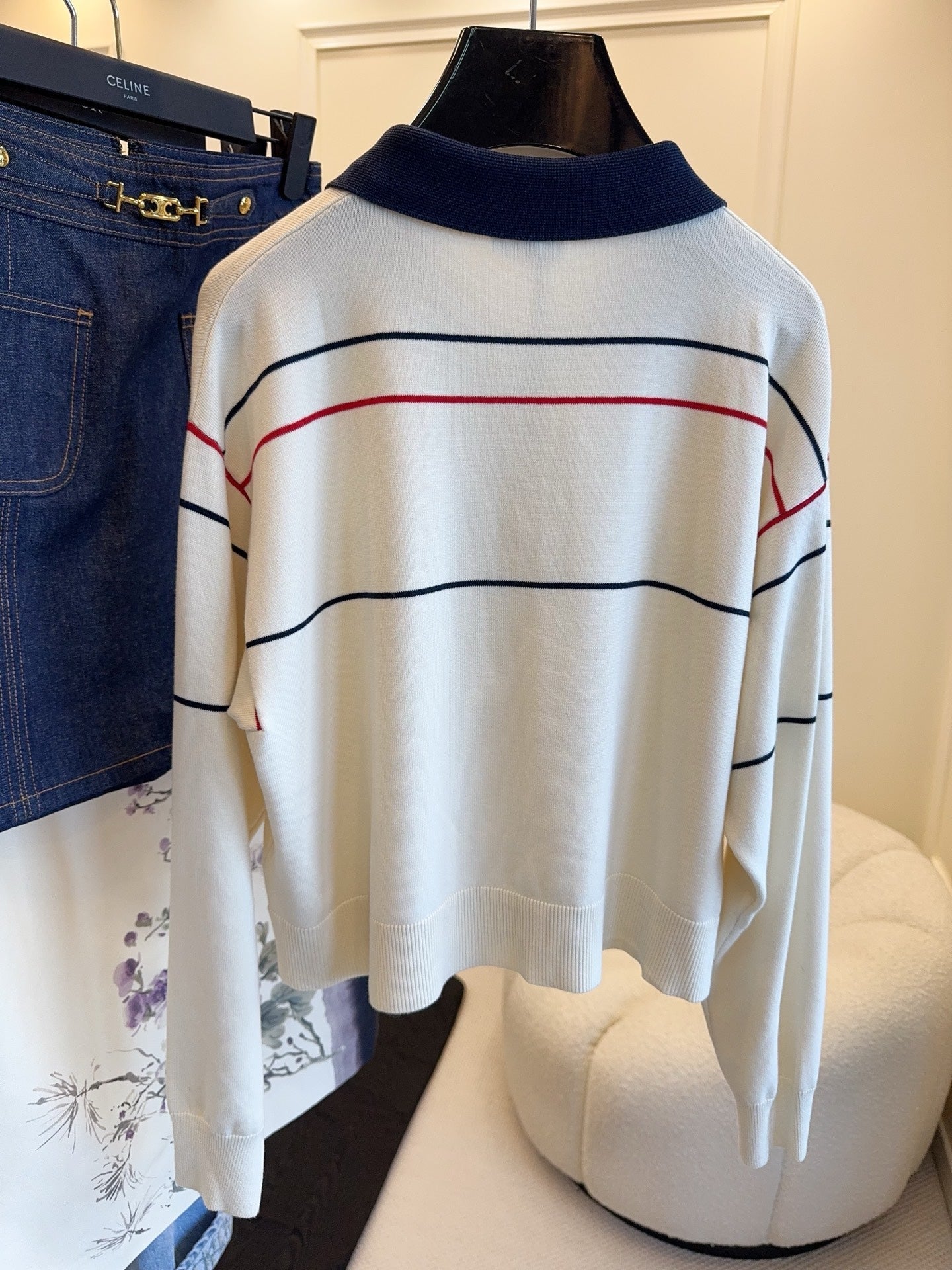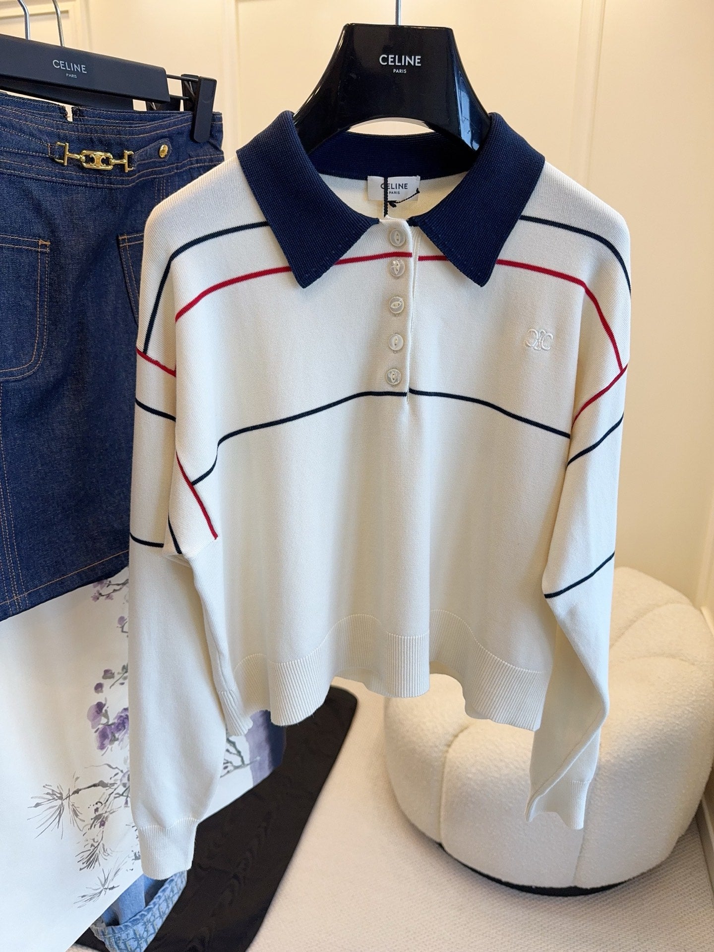 Celine 25 Polo Long Sleeves Shirt White Silk Cotton
