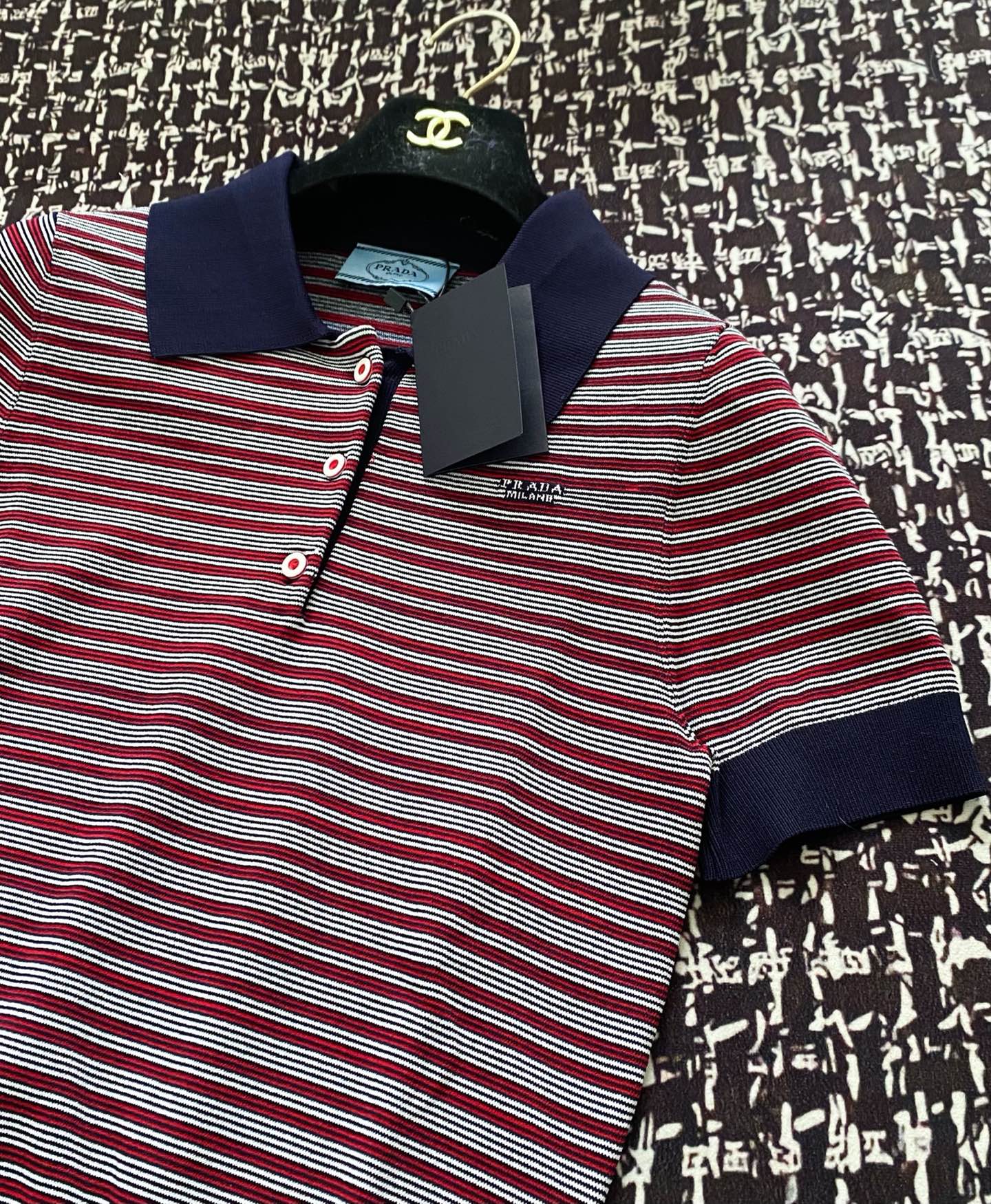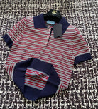Prada 25 Striped Polo Shirt Navy Blue mix Red Tencel Wool