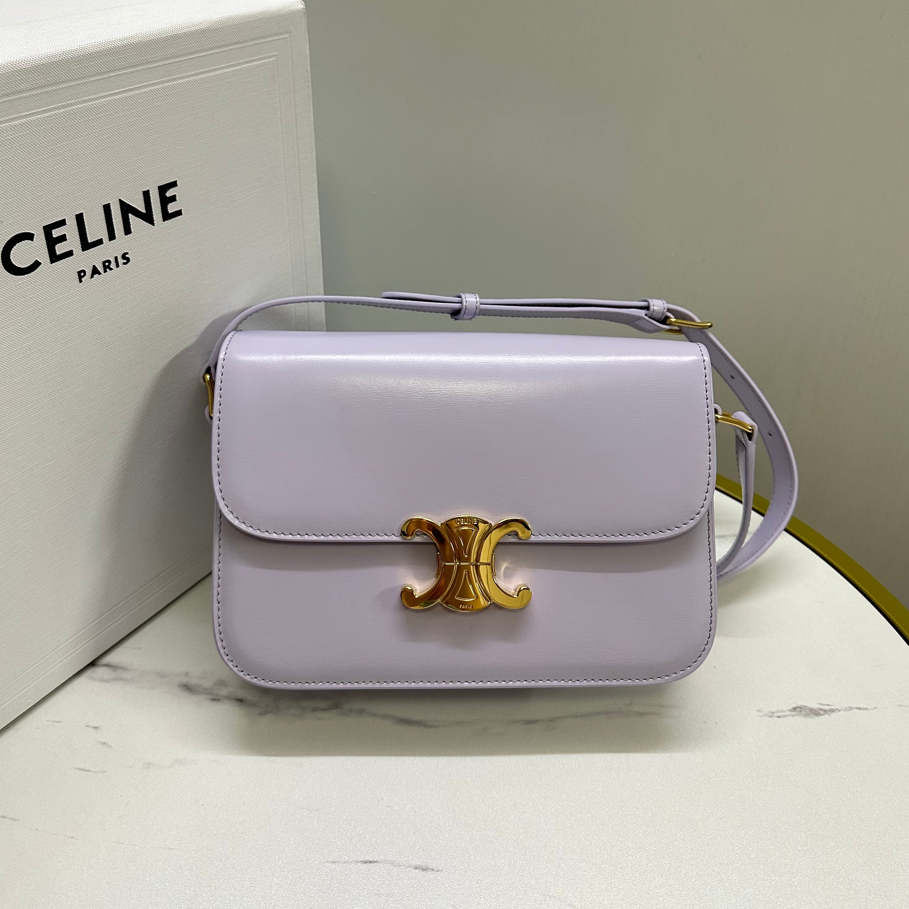 - Color: Light lilac, Gold hardware