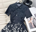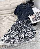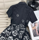 CD 2025 Floral Short-sleeved Belt Shirt Dress Black mix White Cotton