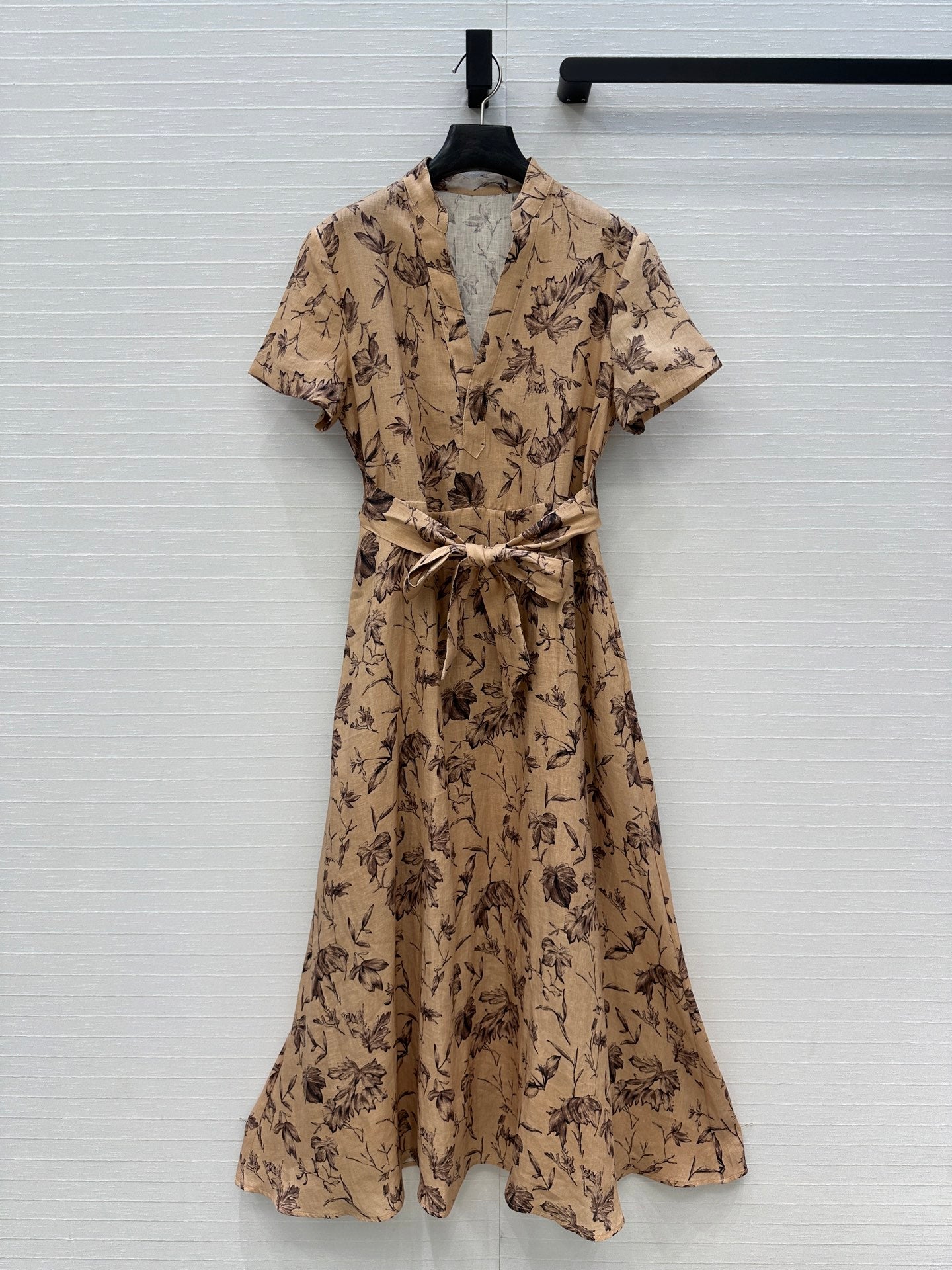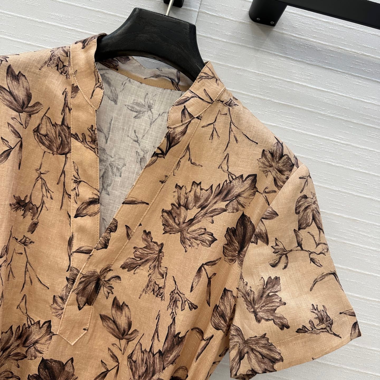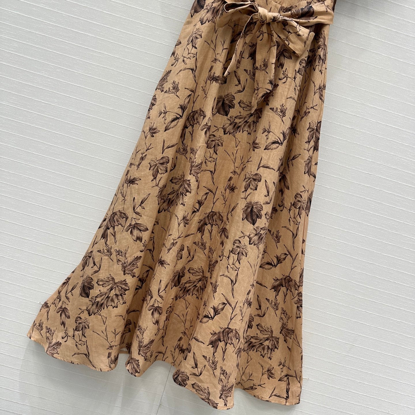 CD 25 Floral Print V-neck Long Skirt Beige mix Dark Brown Linen