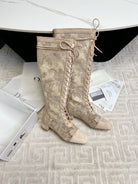 CD Naughtily-D Heeled High Boots Beige Transparent Mesh Roses Embroidery And Suede