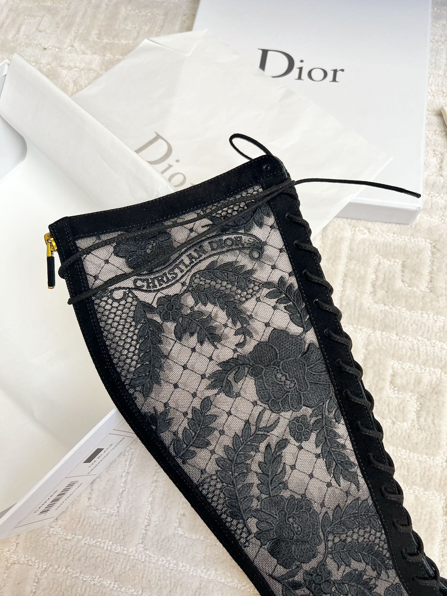 CD Naughtily-D Heeled High Boots Black Transparent Mesh Roses Embroidery And Suede