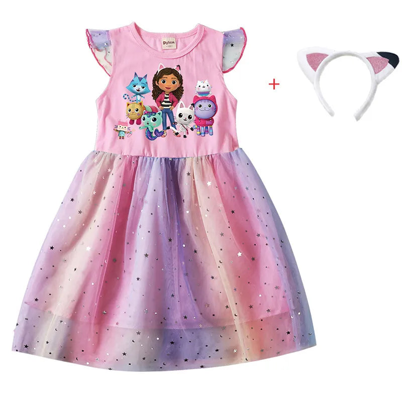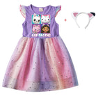 Cartoon Gabby Cats Baby Girl Dresses Kids Gabby's Doll House Clothes Cosplay Costume Children Fly Sleeve Casual Dress + Headband.