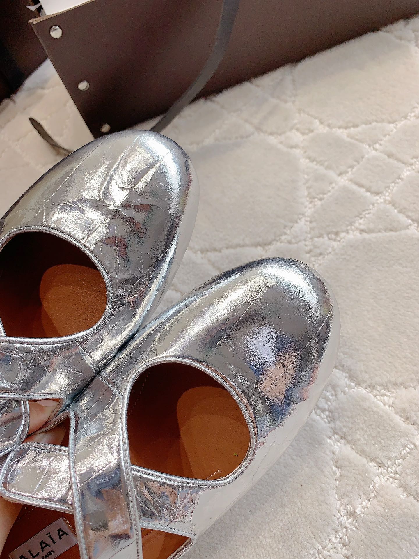 ALAIA CRISS CROSS BALLET FLAT IN SILVER LAMBSKIN