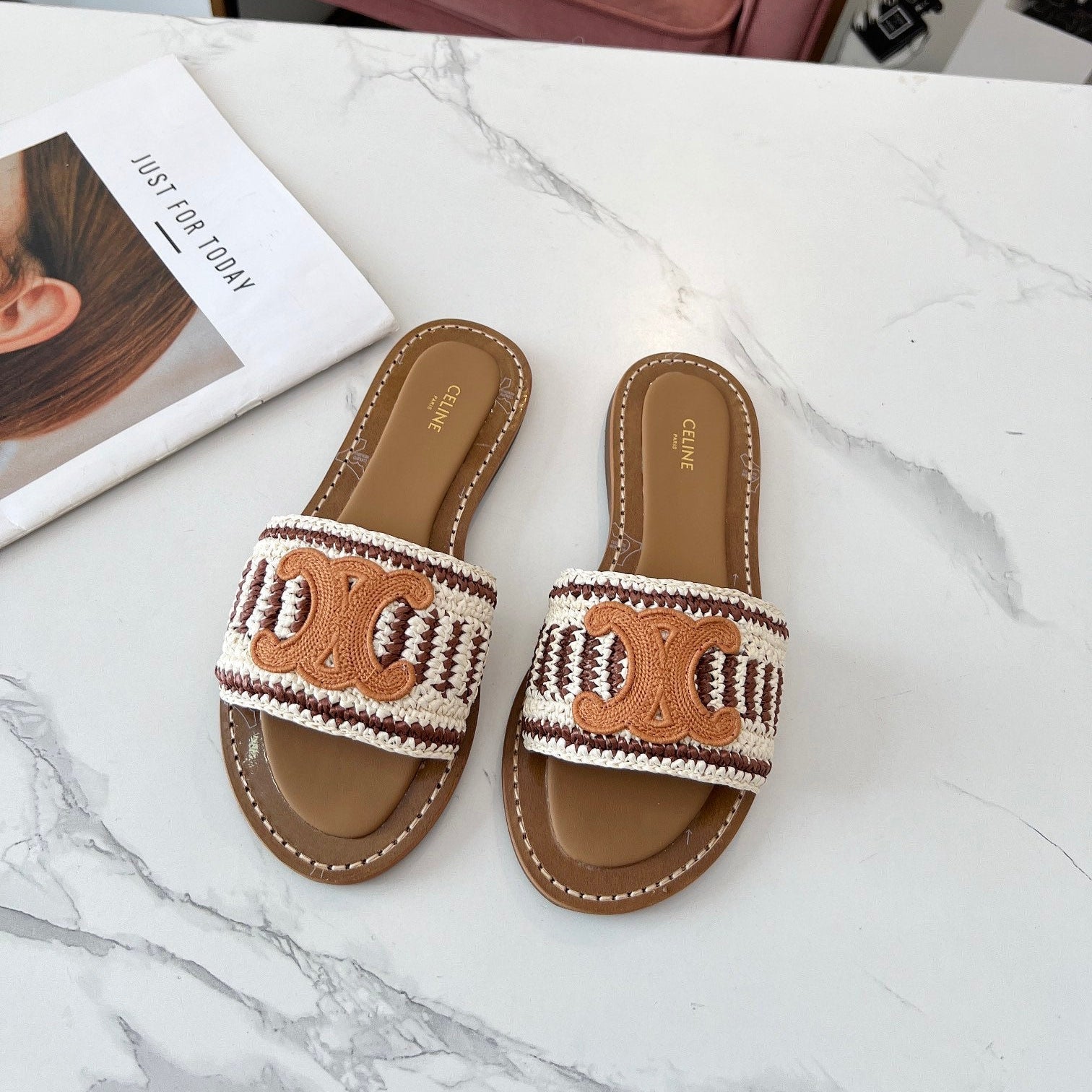 Celine 25C Slippers Beige mix Cantaloupe Fabric with Calfskin 238159