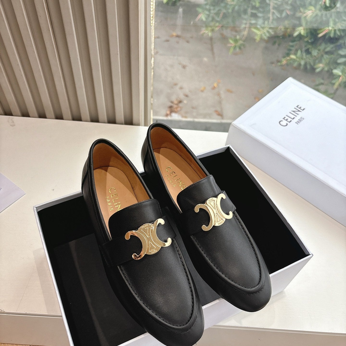CELINE Buckle Triomphe Loafers Black Leather