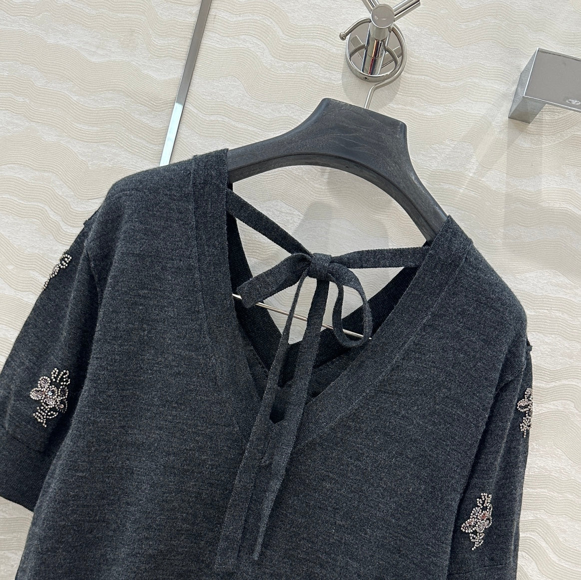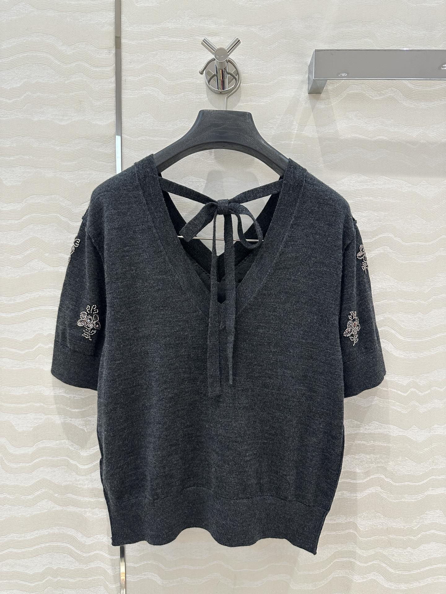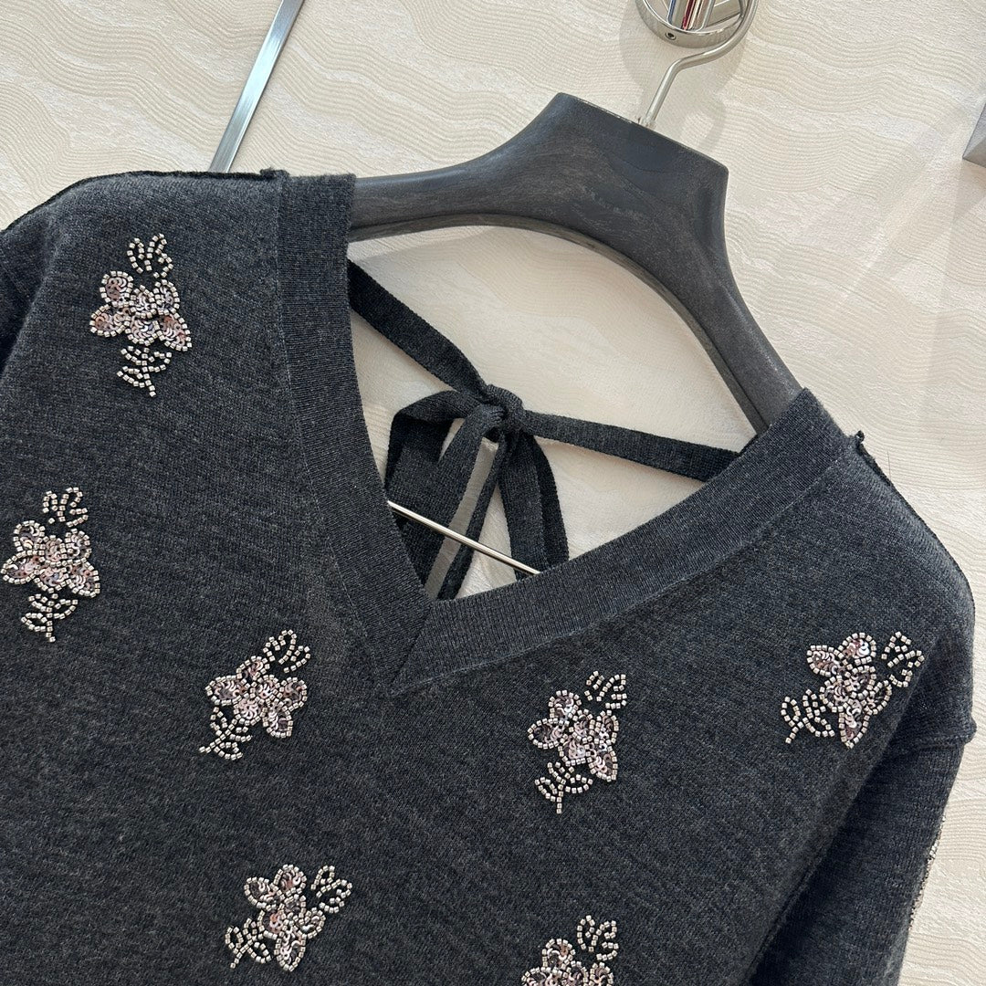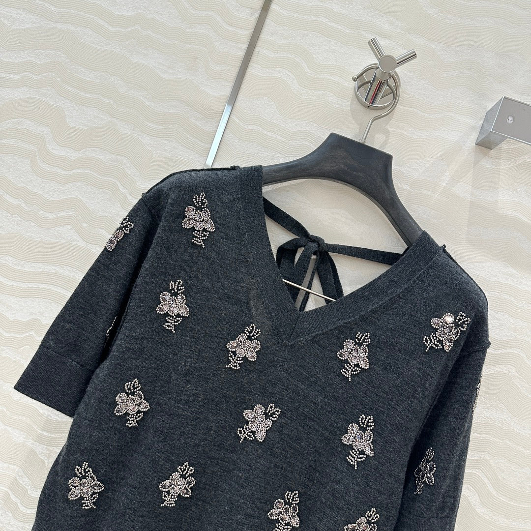 Fendi Beaded Flower V-neck Knitted Small Top Black Gray Wool