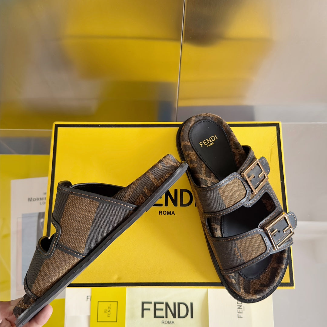 FENDI DAD SANDAL IN MOCHA BROWN MIX BLACK MONOGRAM JACQUARD FABRIC