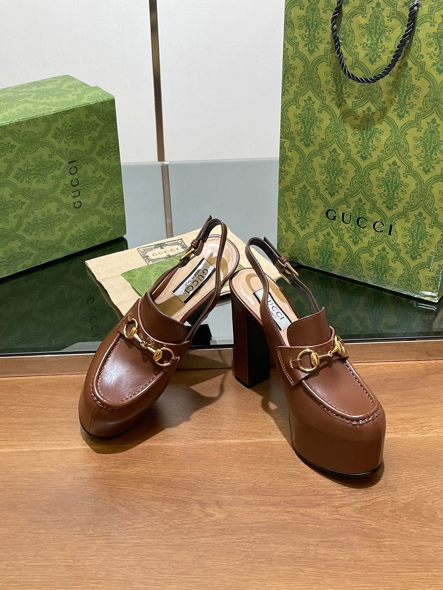 GG WOMEN'S HORSEBIT PLATFORM SLINGBACK IN DARK BROWN CALFSKIN