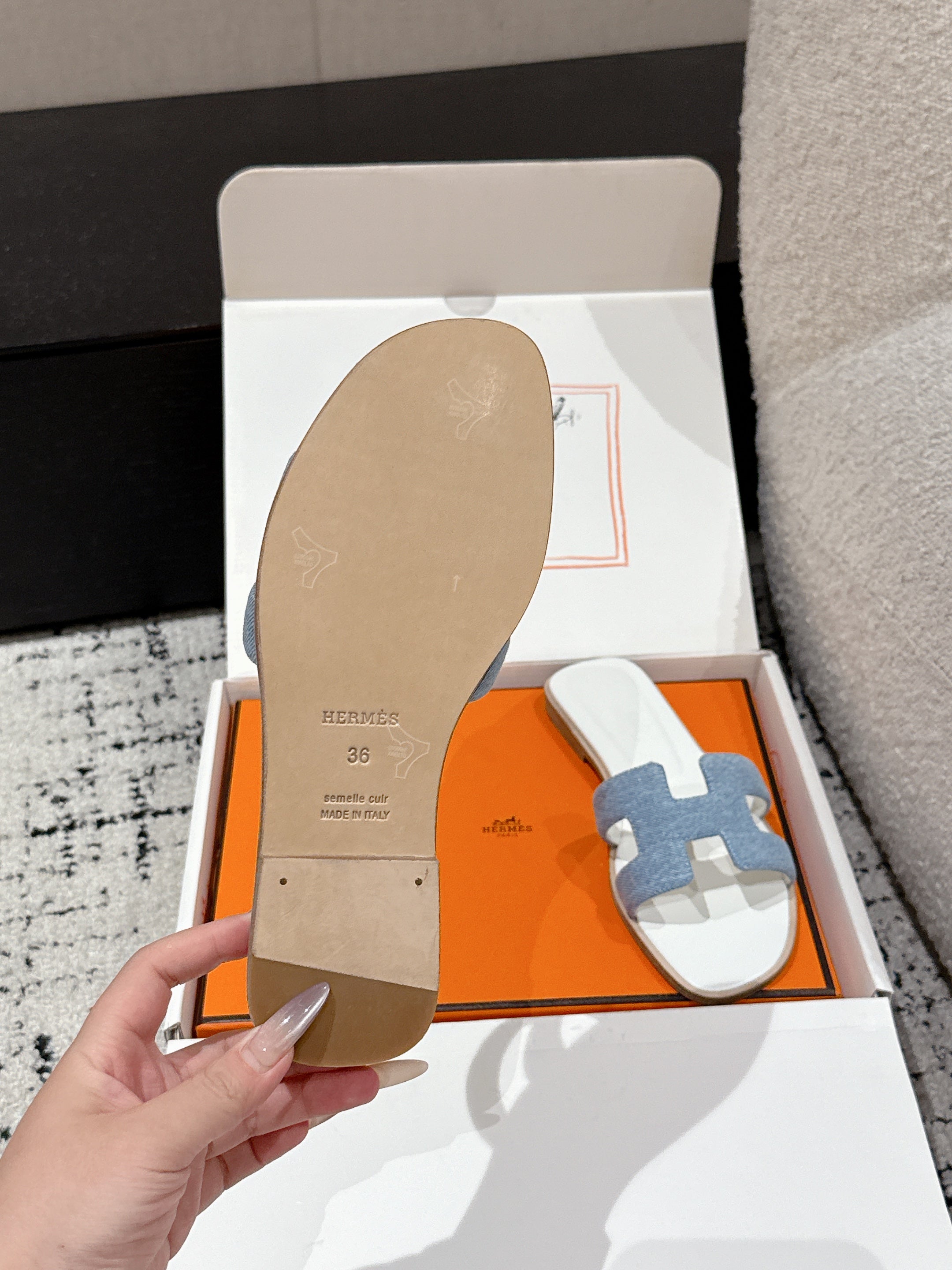 HM 25 Oran Sandal White Calfskin Blue Denim