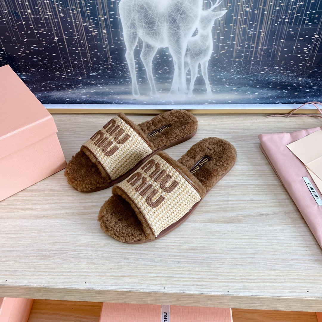 Miu Slipper Beige And Brown Woven Raffia