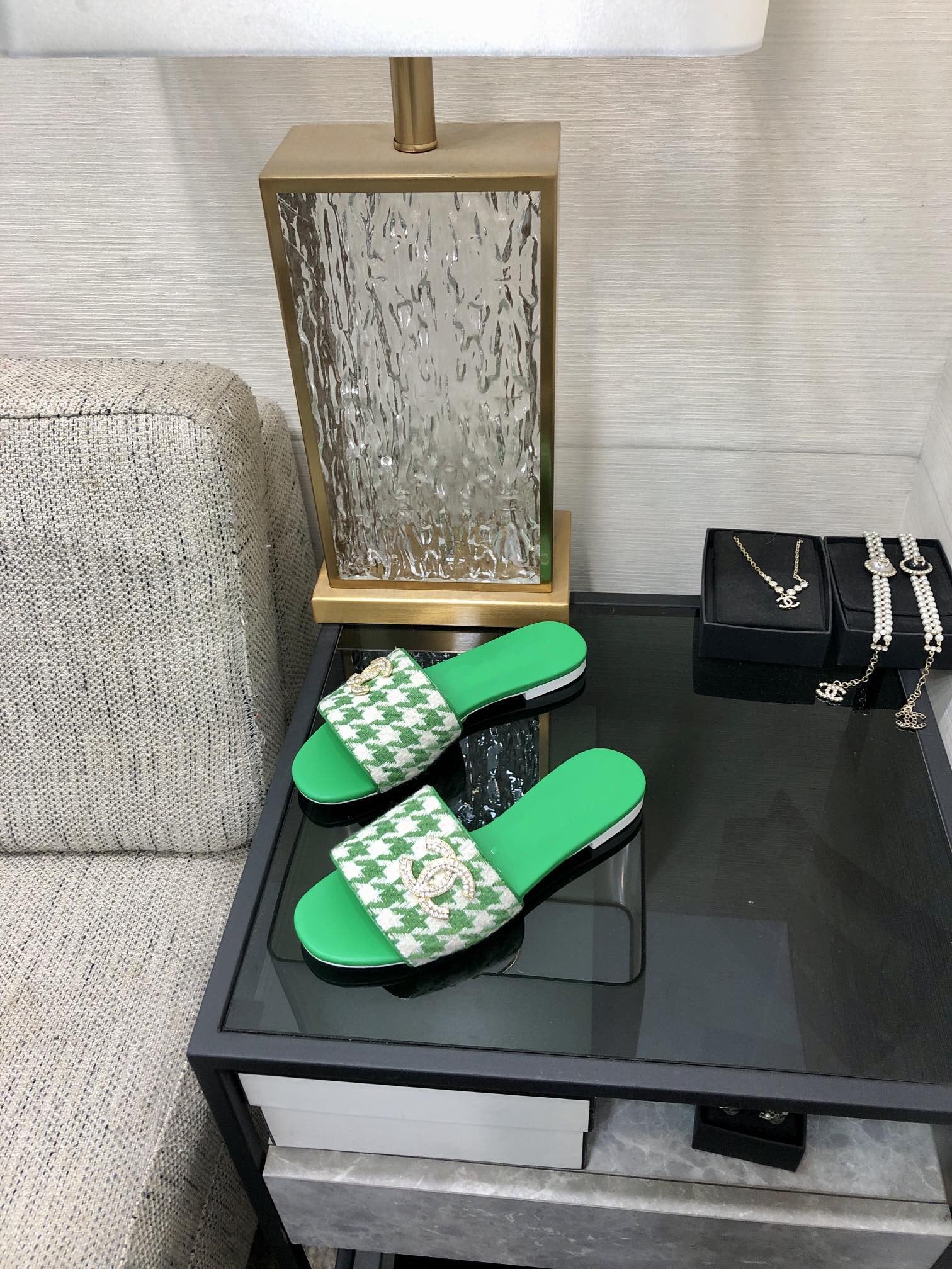 mule sandal green white houndstooth fabric