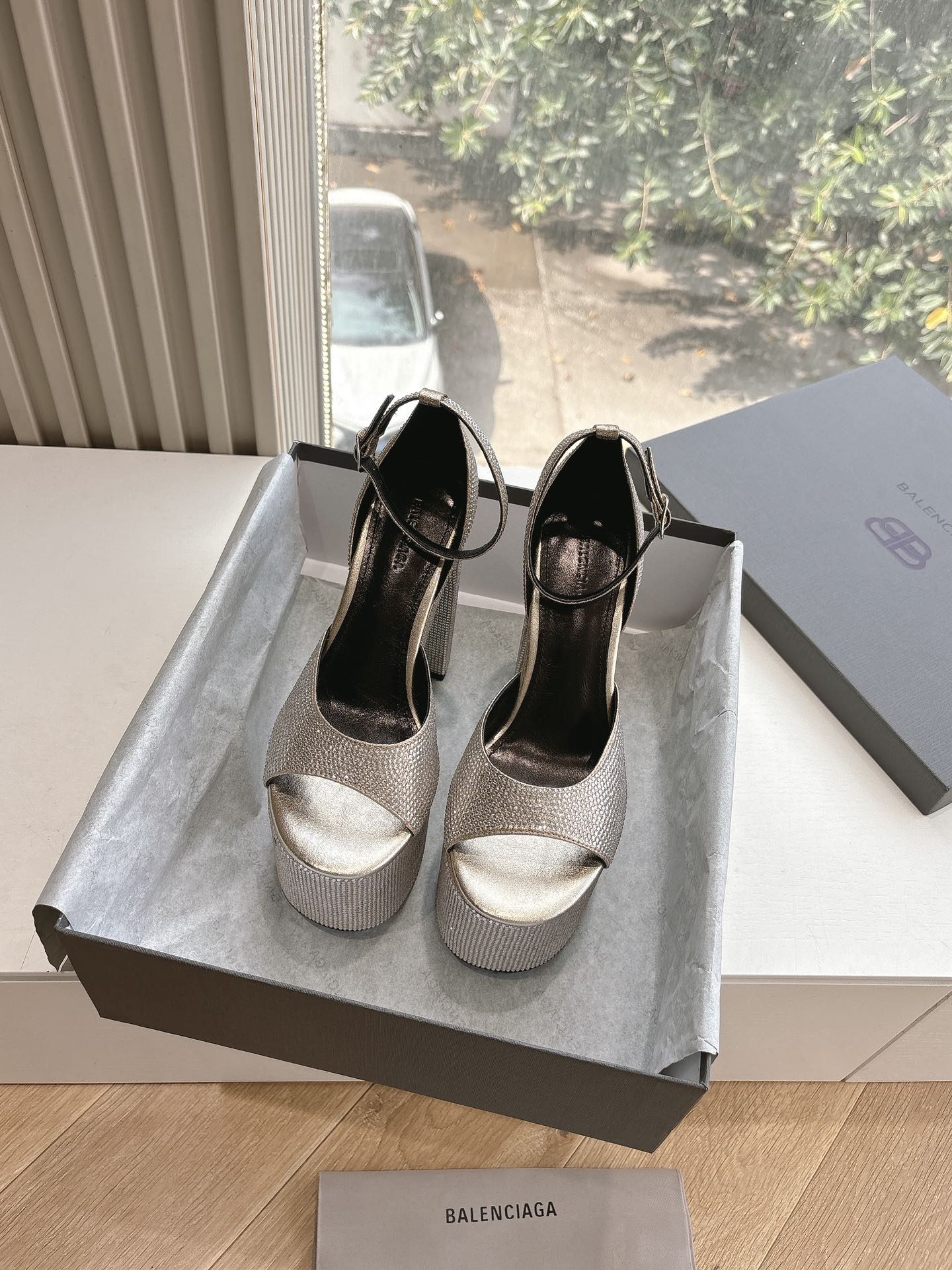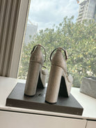 PLATFORM ANKLE STRAP HEELS IN BEIGE METALLIC ATTACHED RHINESTONES CALFSKIN