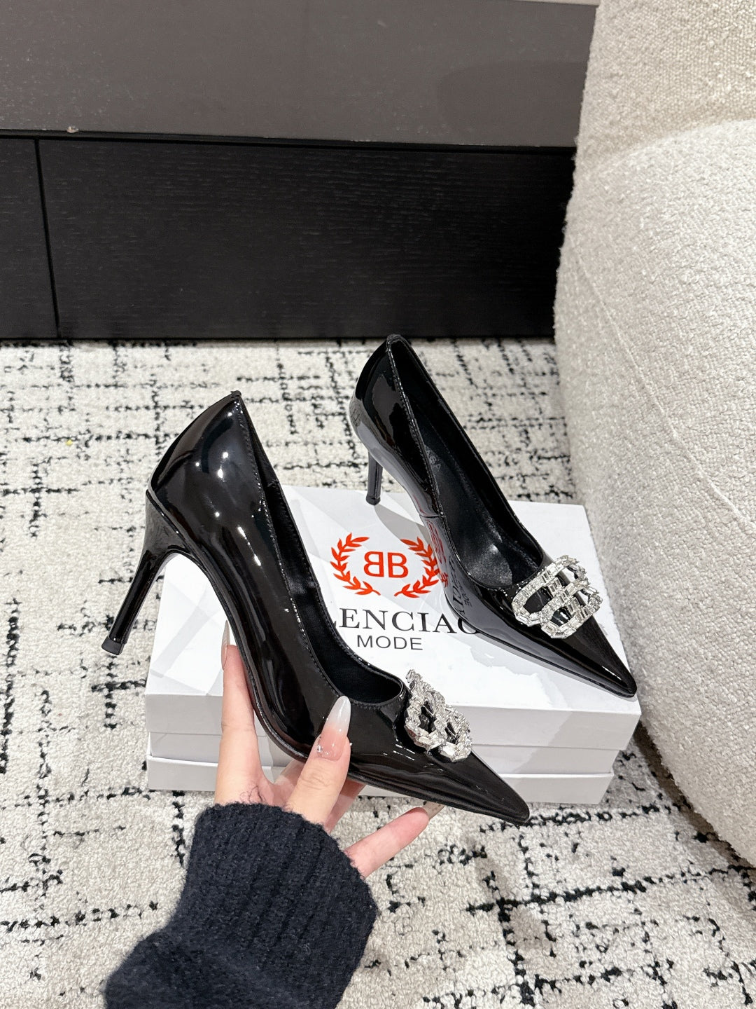 POINTED HIGH PUMPS IN BLACK PATENT CALFSKIN WITH CRYSTAL BUCKLE