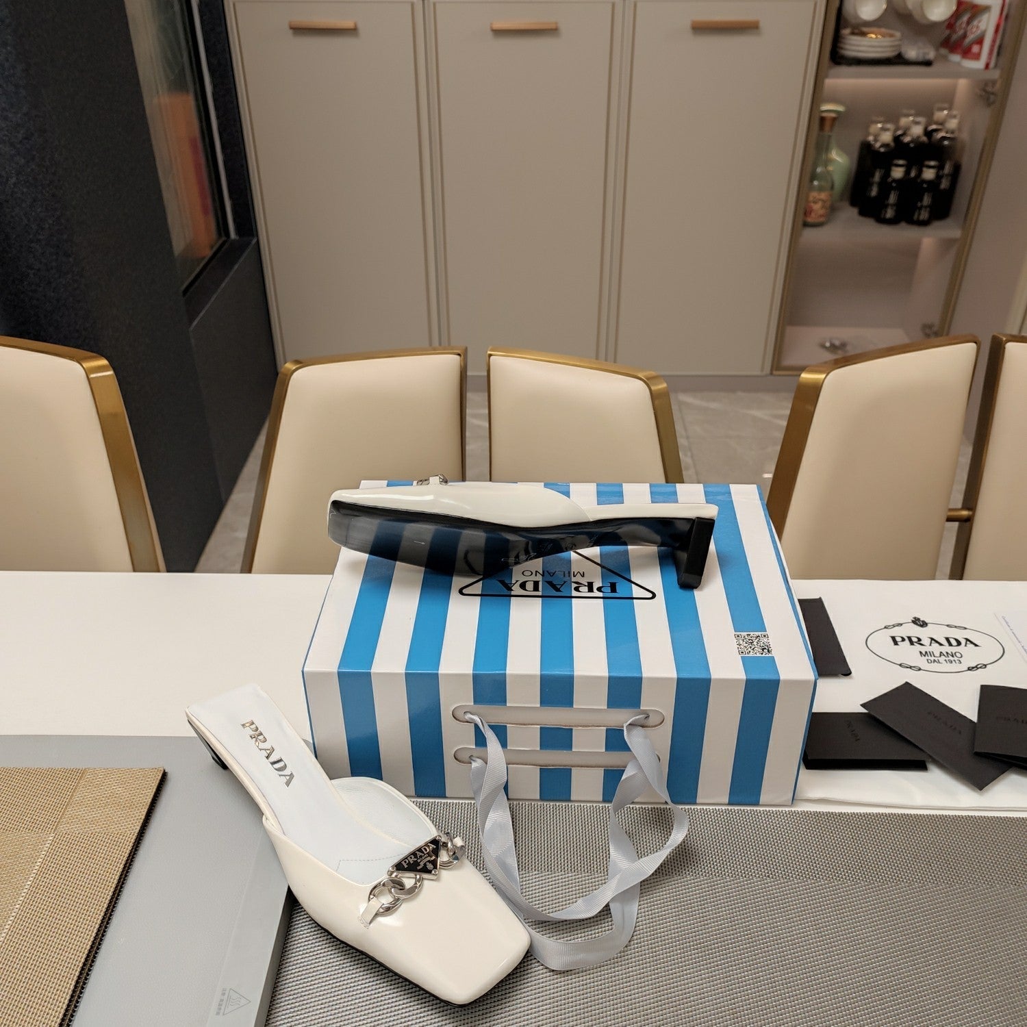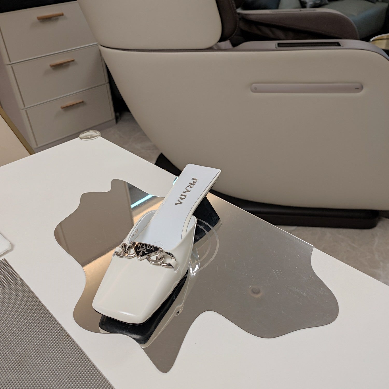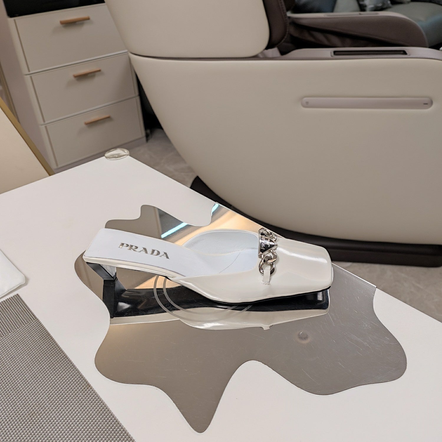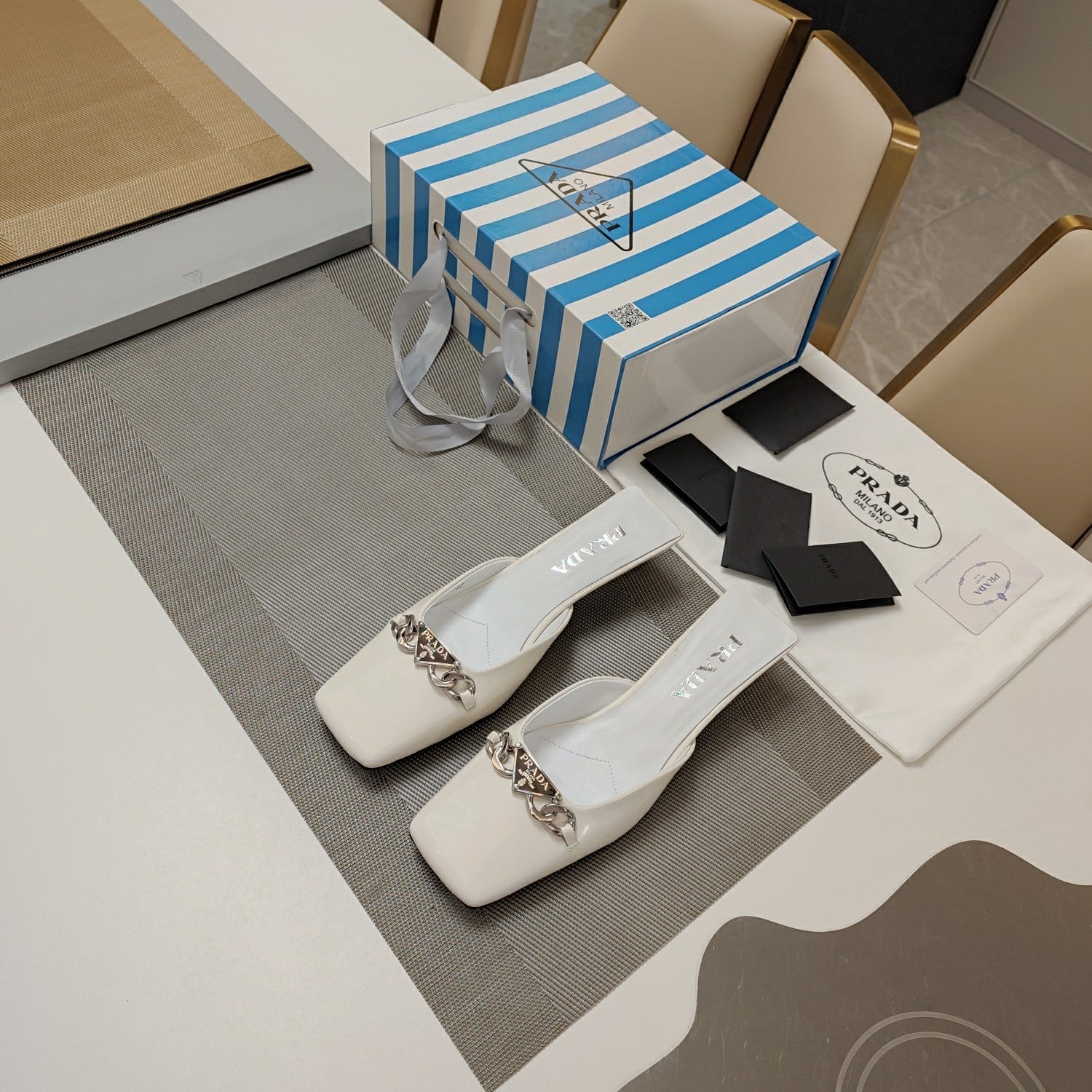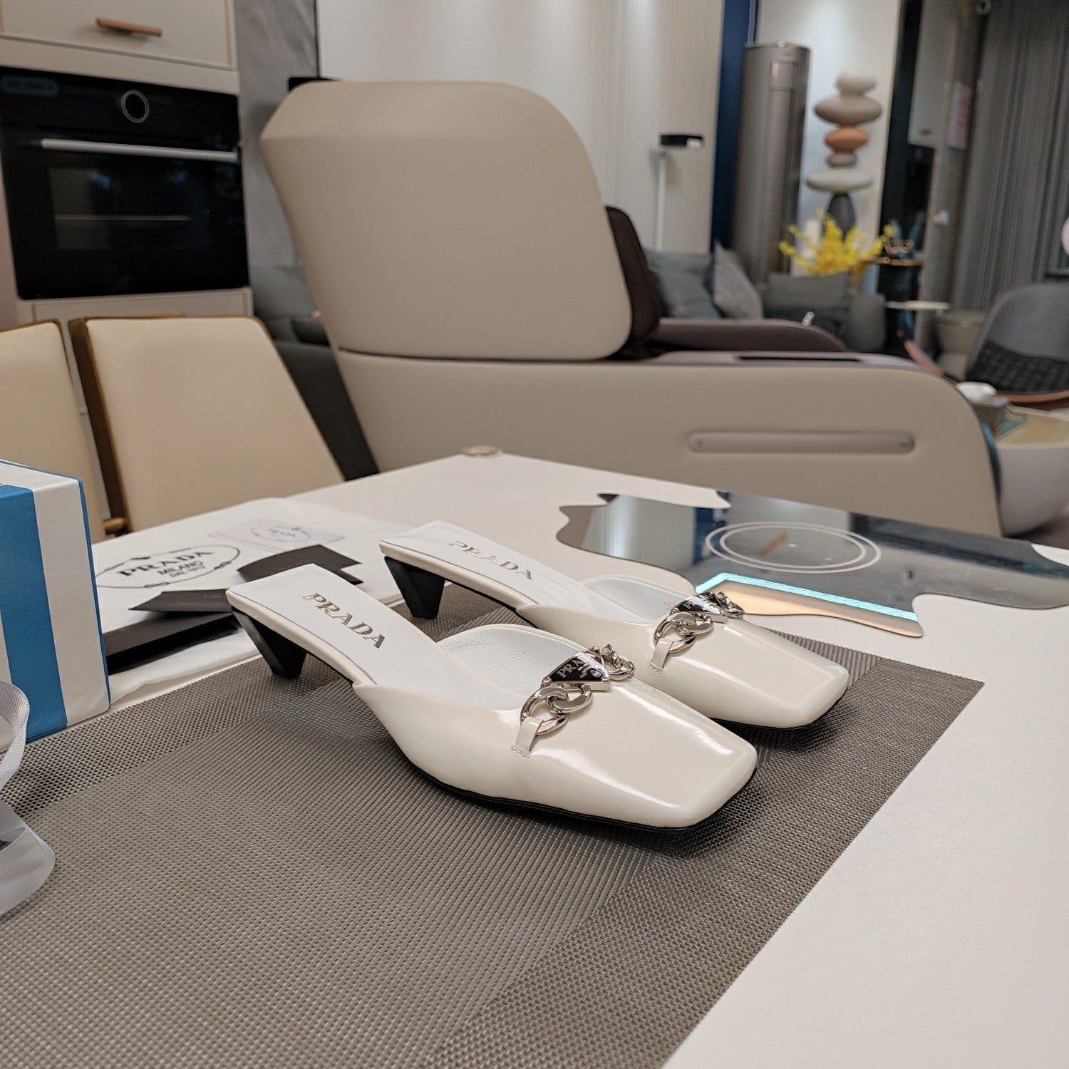 PRA SQUARE TOE MULES WHITE CALFSKIN WITH CHAIN
