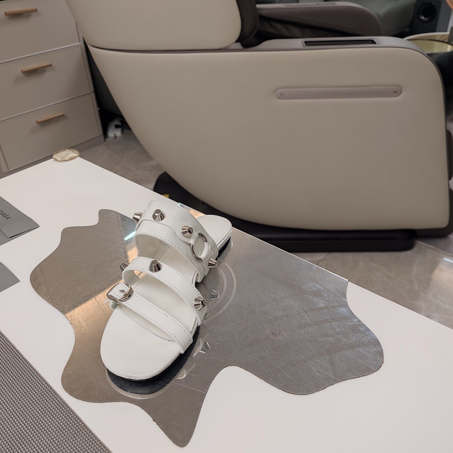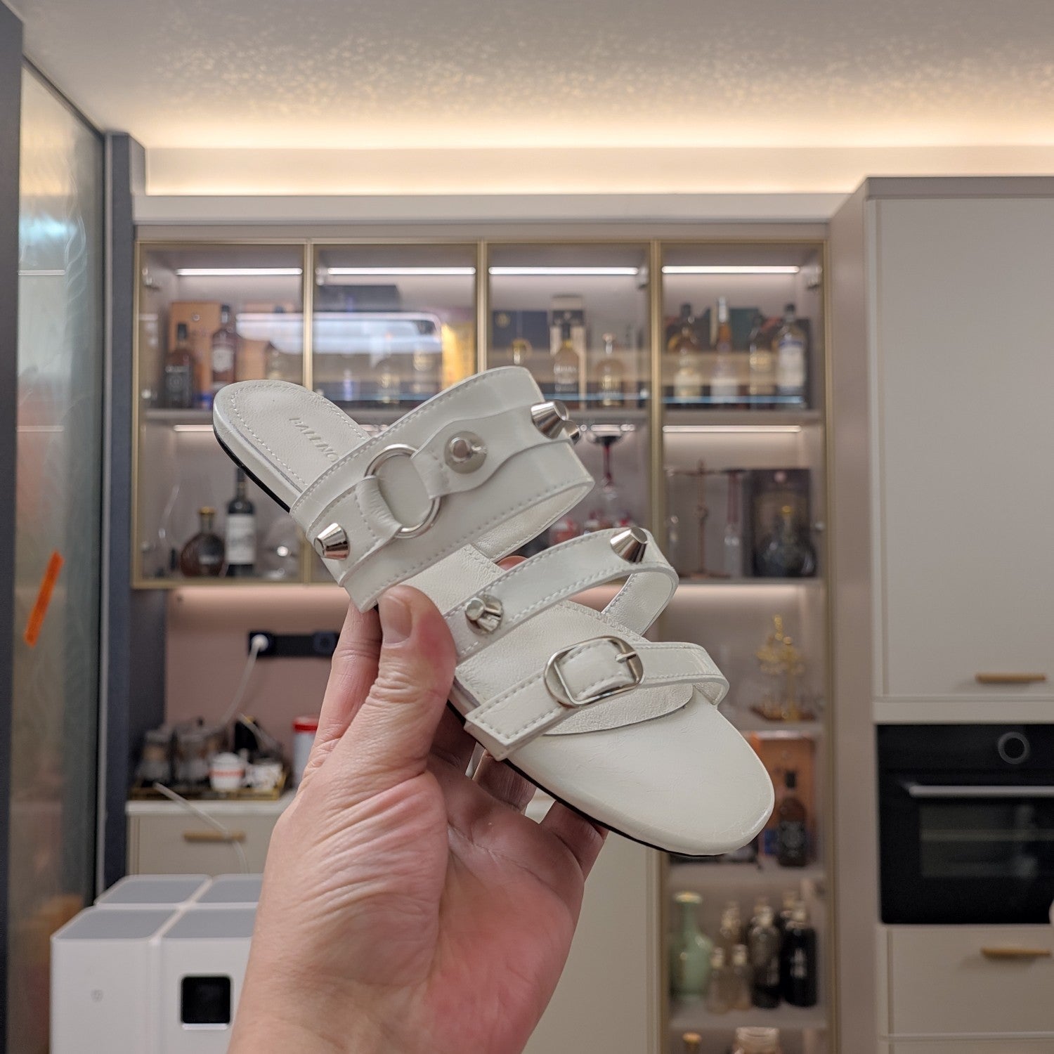 STRAPPY FLAT SANDALS IN WHITE STUDDED WAX-OIL SHEEPSKIN