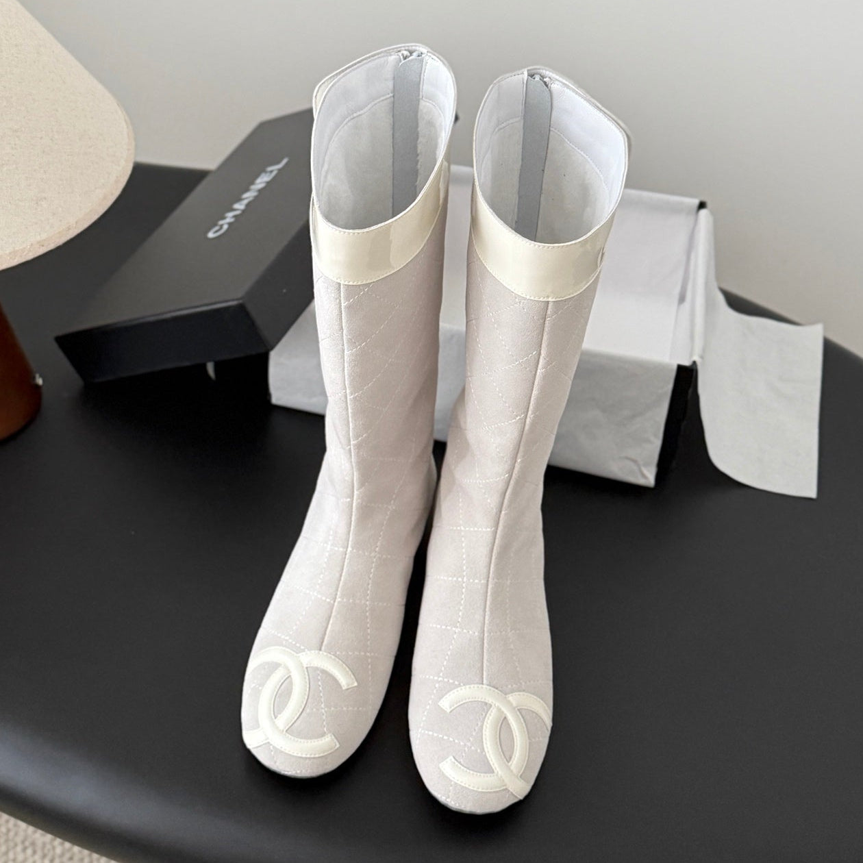 CC 2025 Vintage Cambon Mid-Calf Boots White Suede Patent Leather 550639