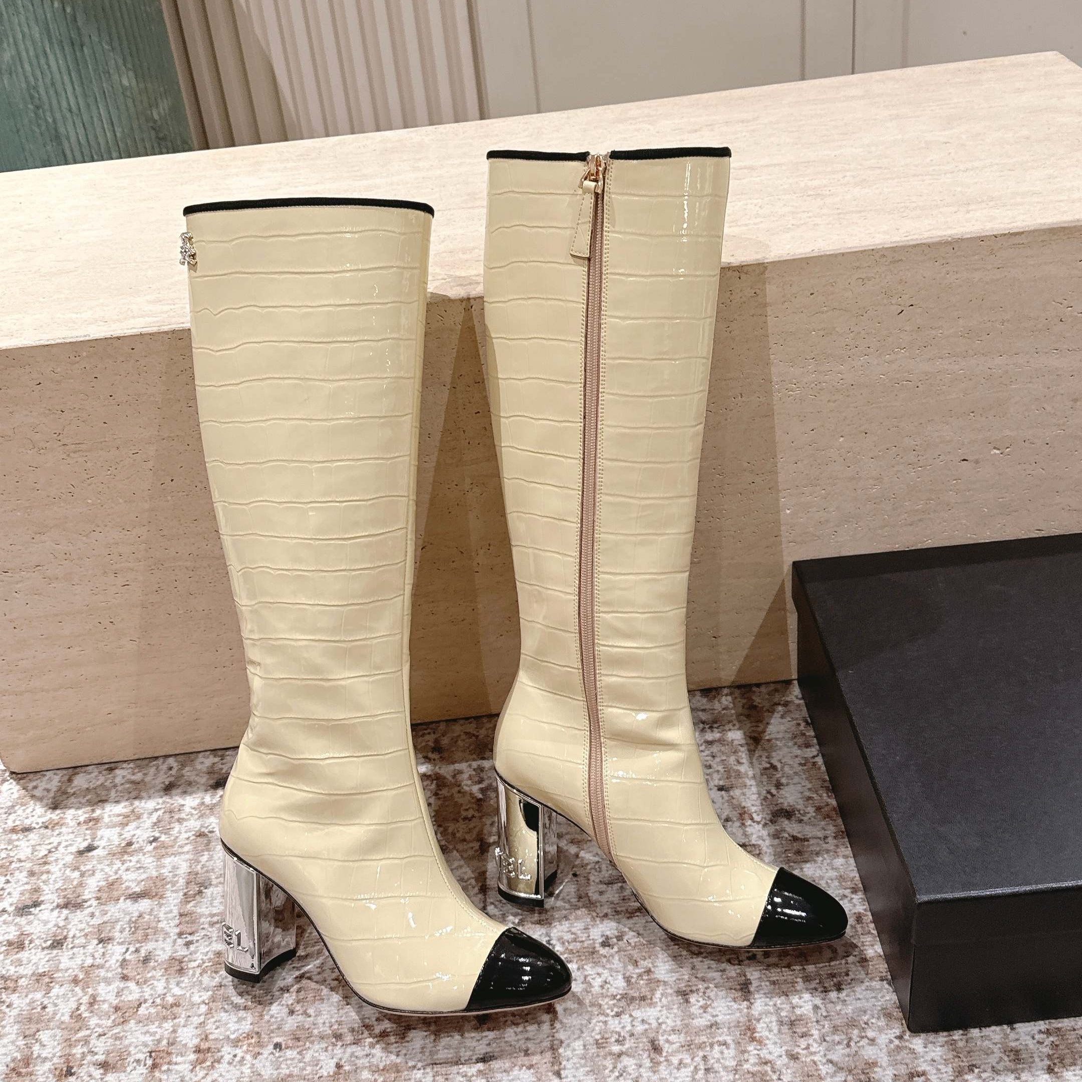 CC high-heeled boots beige black patent calfskin 532835