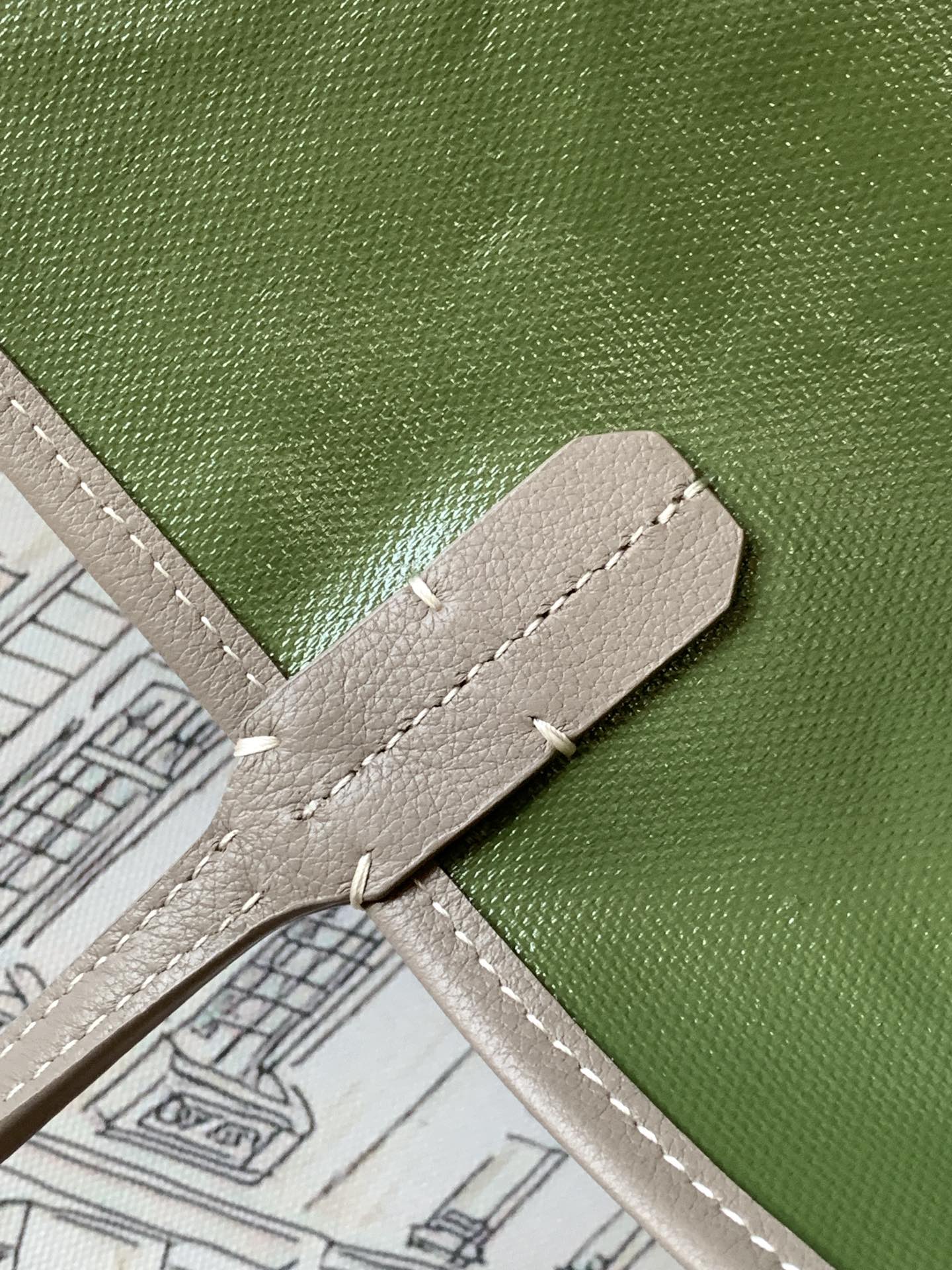 • Material: This St. Louis PM tote is in Greige and Green Goyardine canvas with palladium hardware and features greige leather handles and trim, removable pouch and white stitching.