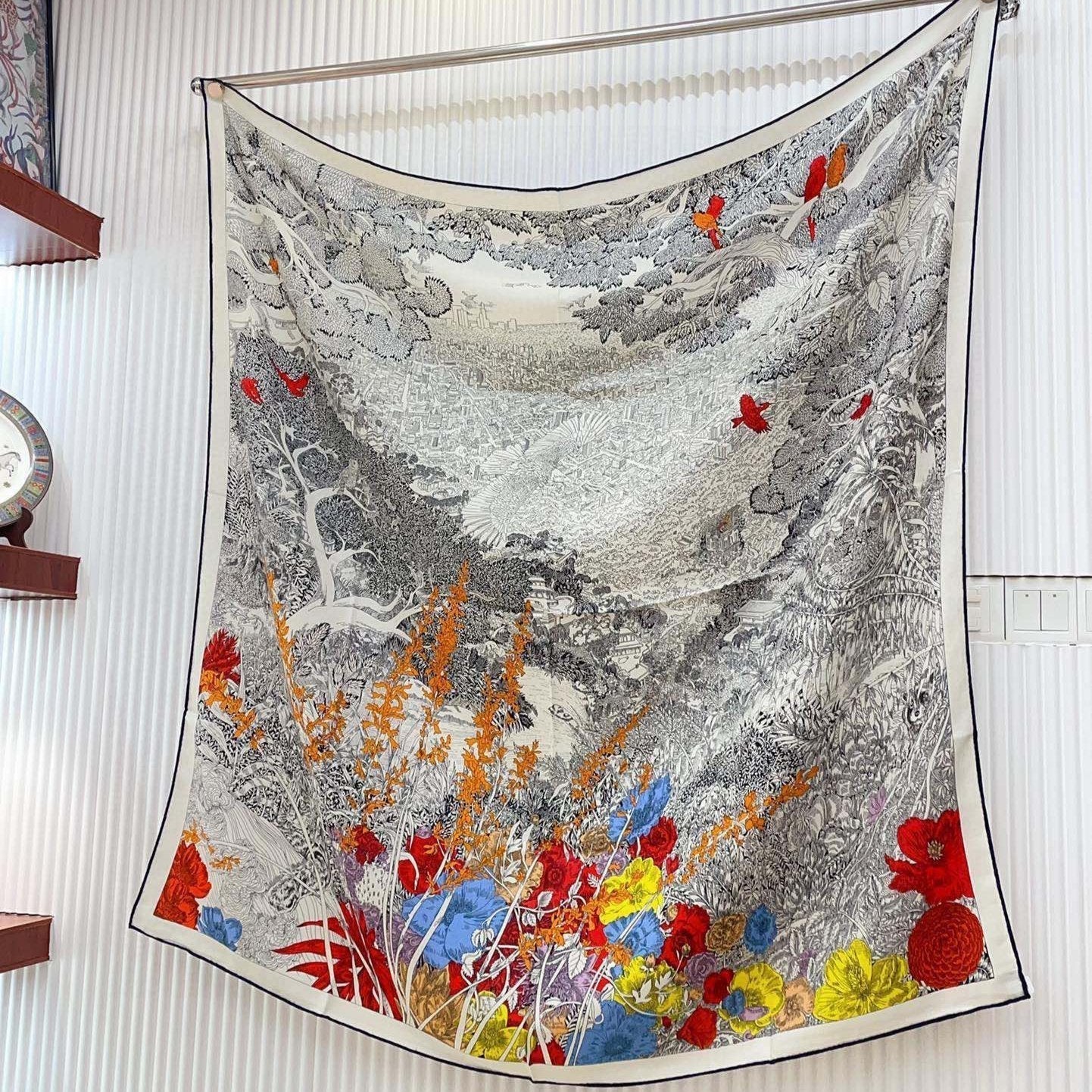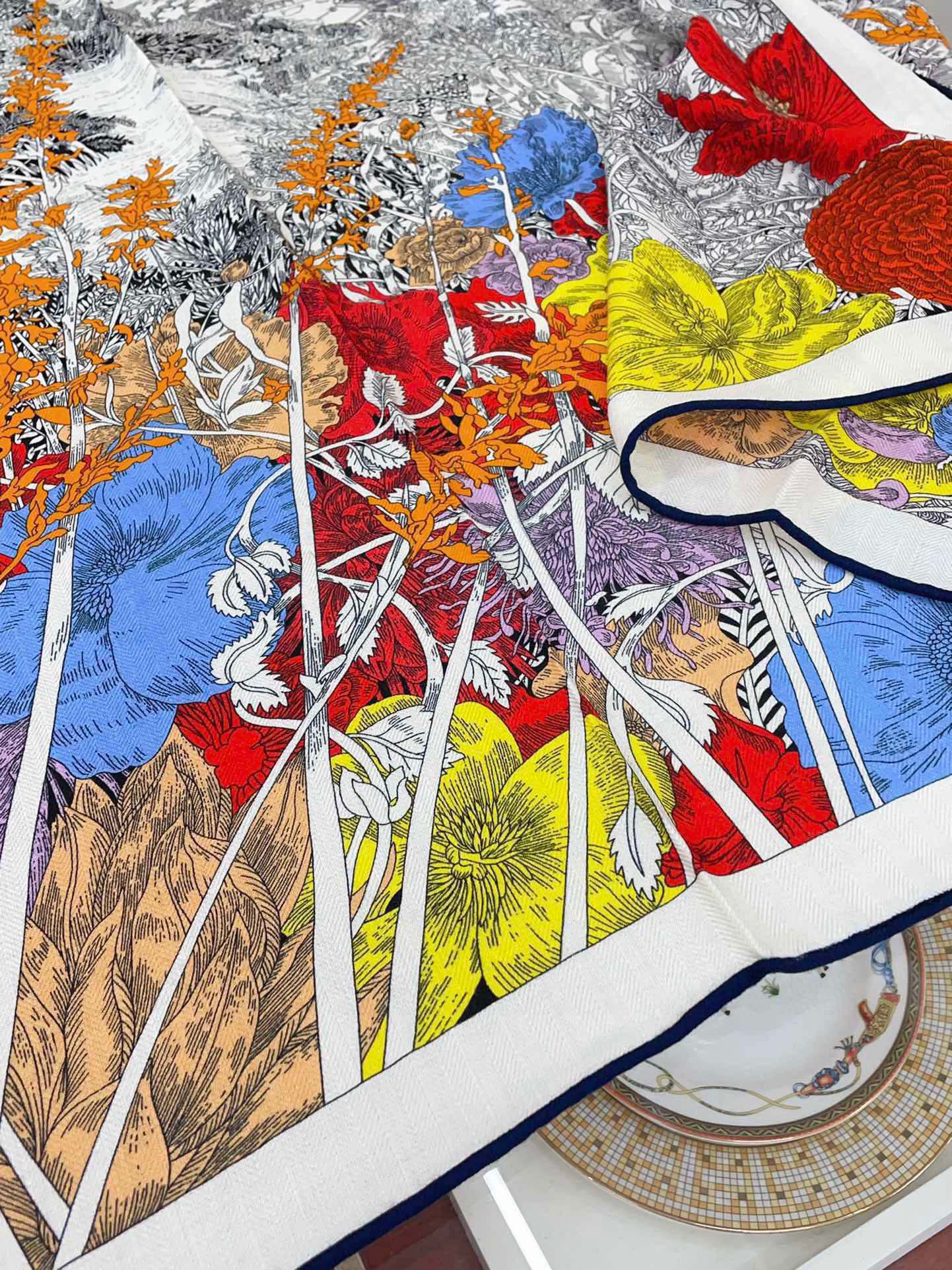 Retour A La Nature Shawl 140CM In Grey White Colorful Cashmere And Silk