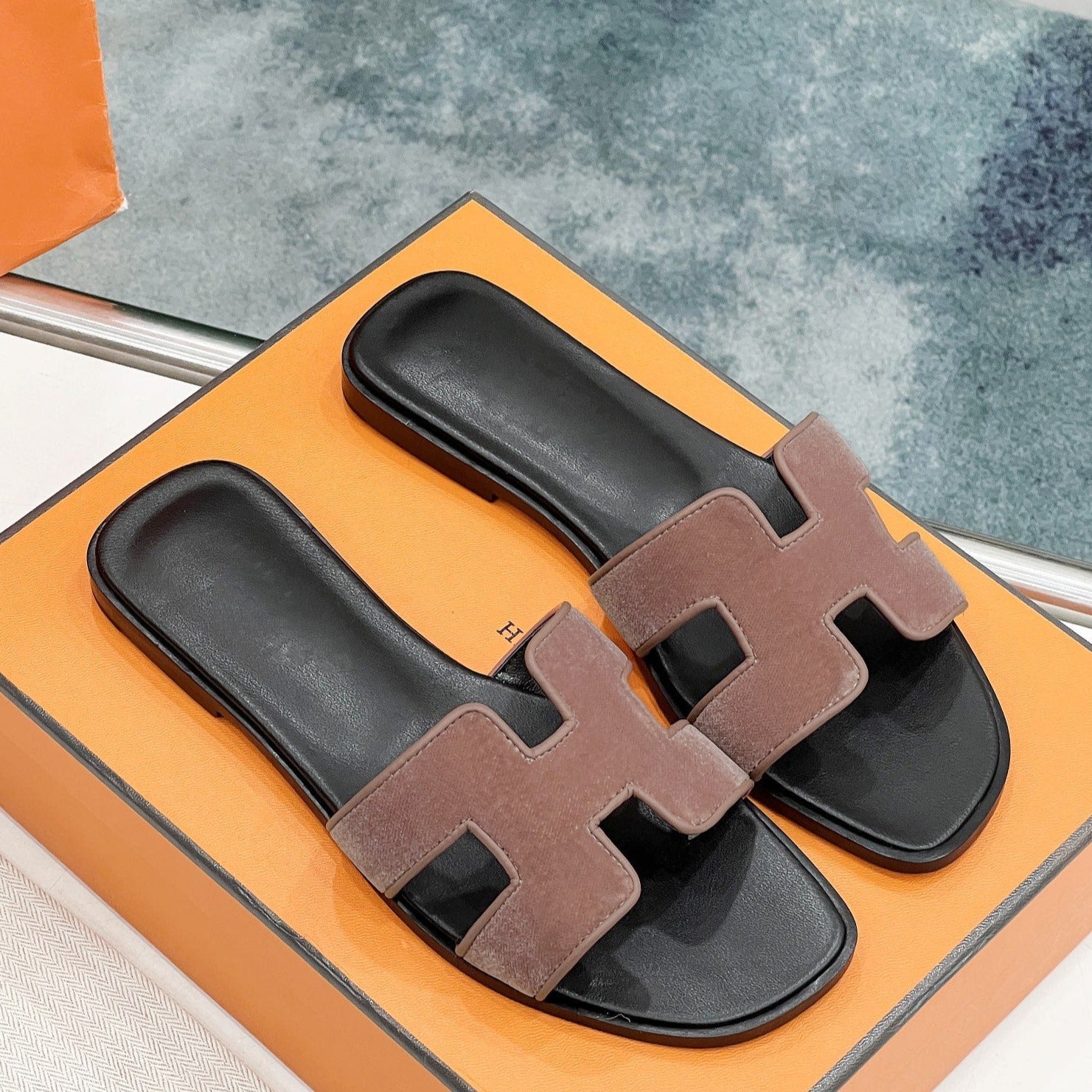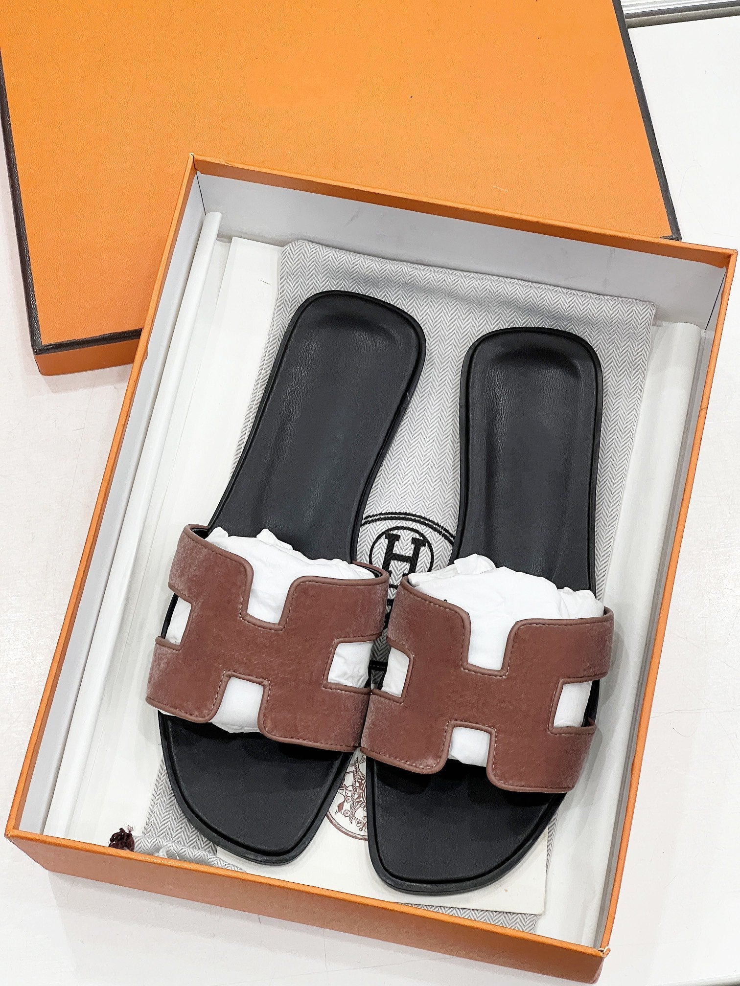 - Material: Sandal in velvet goatskin with iconic "H" cut-out.
