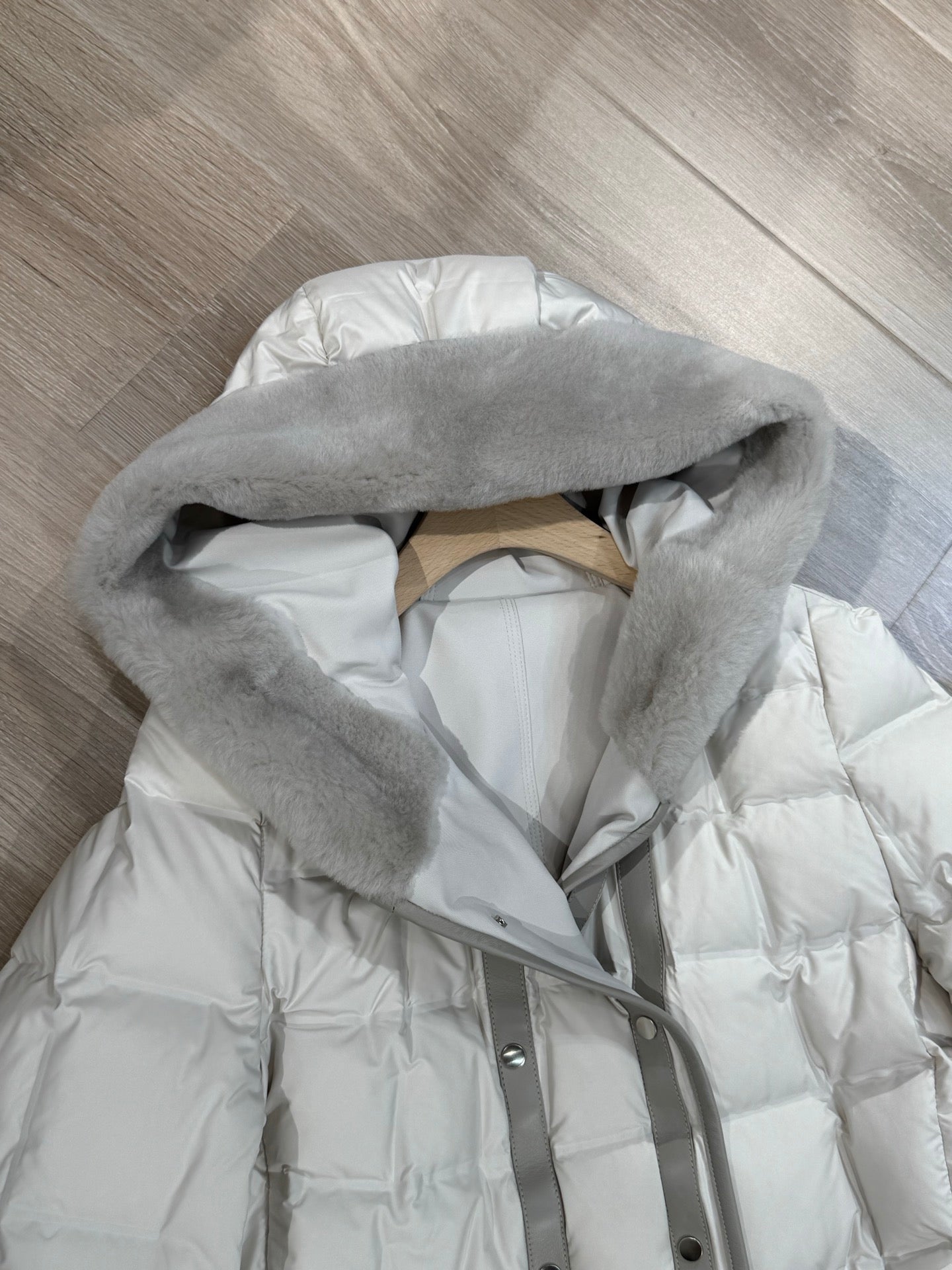 LP 25 Hooded Long Goose Down Light Gray Jacket with Fur Trim 124985