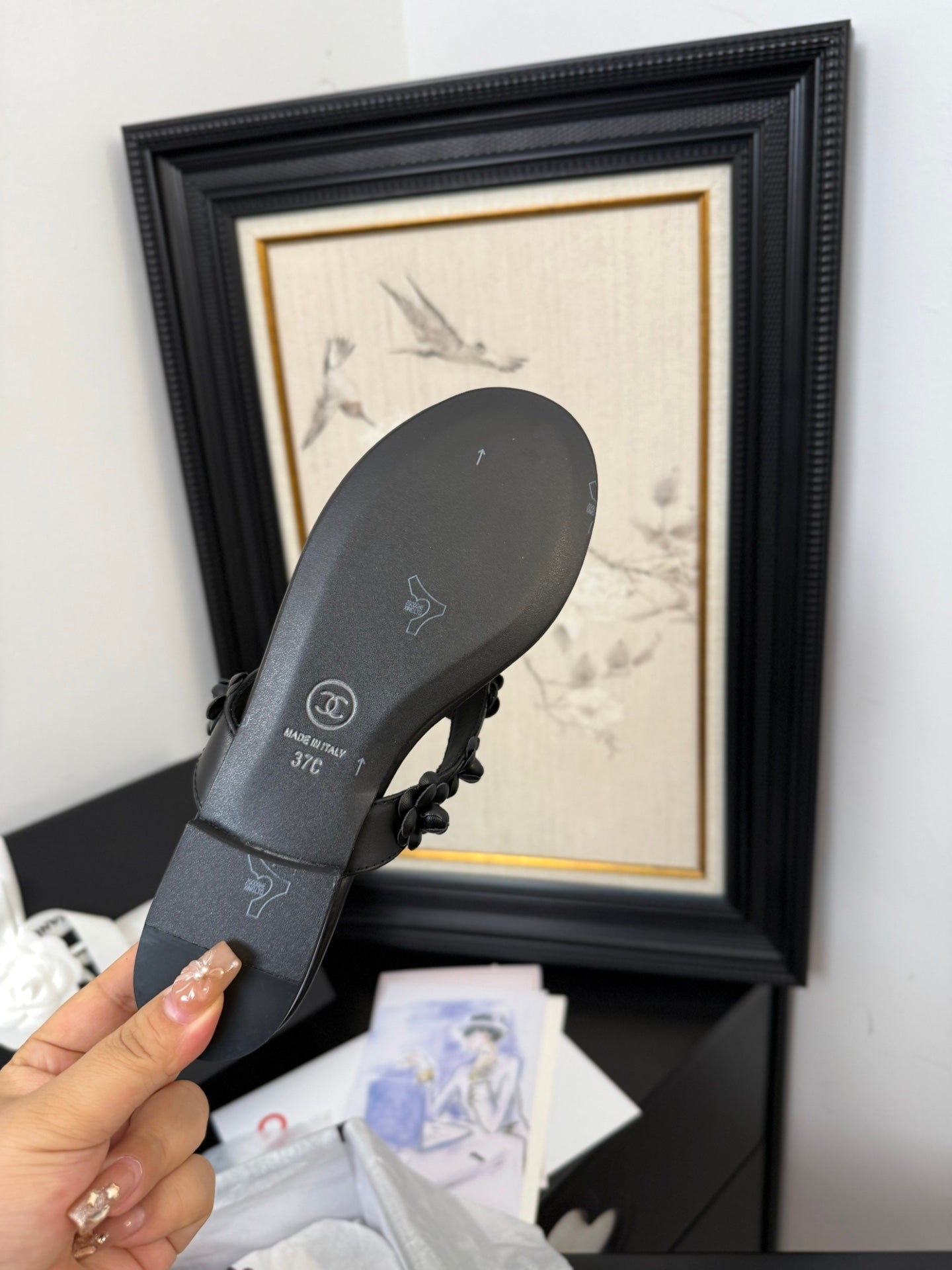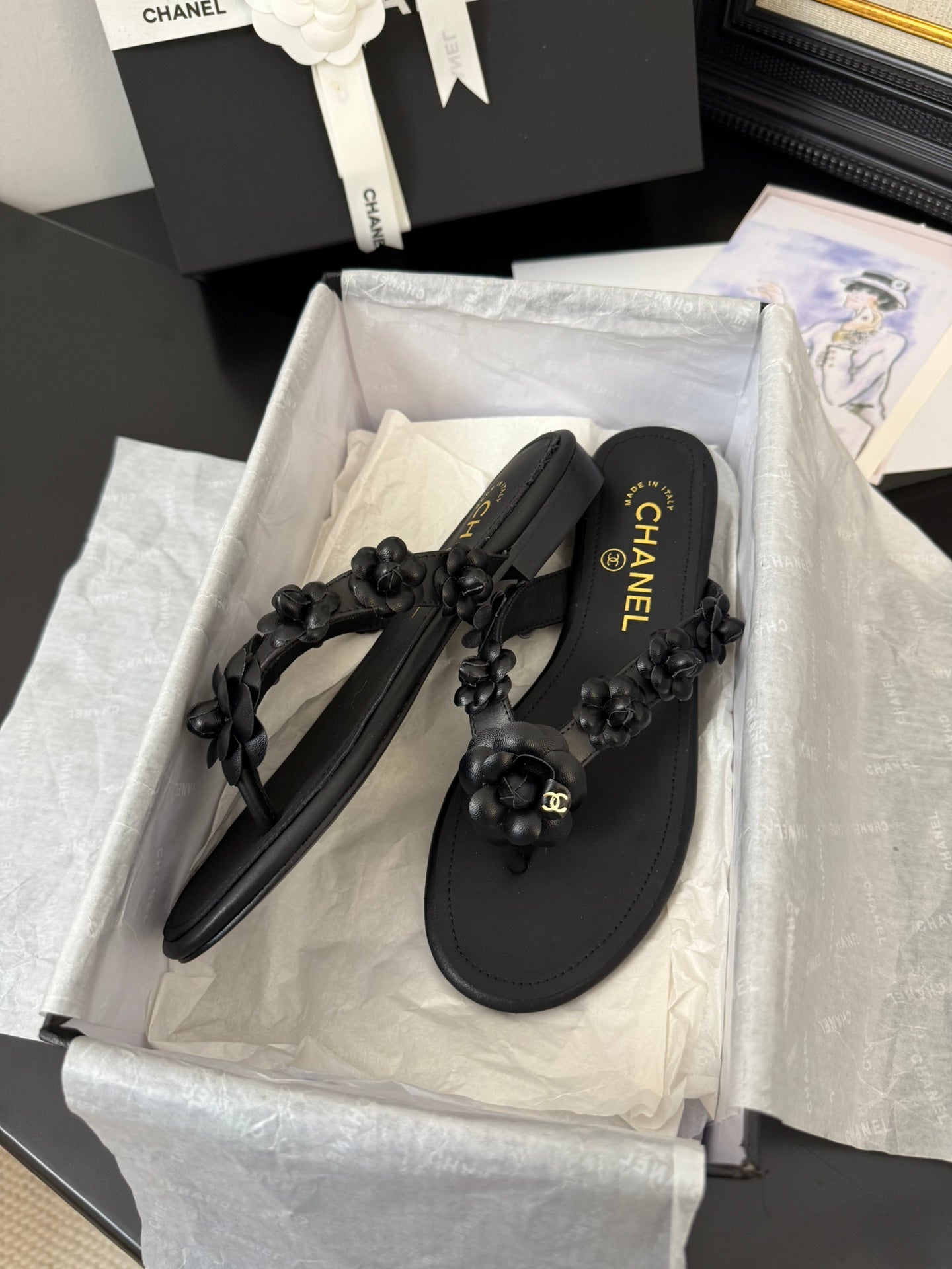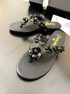CC 25 Flower Thong Slippers Black Cowhide 233414