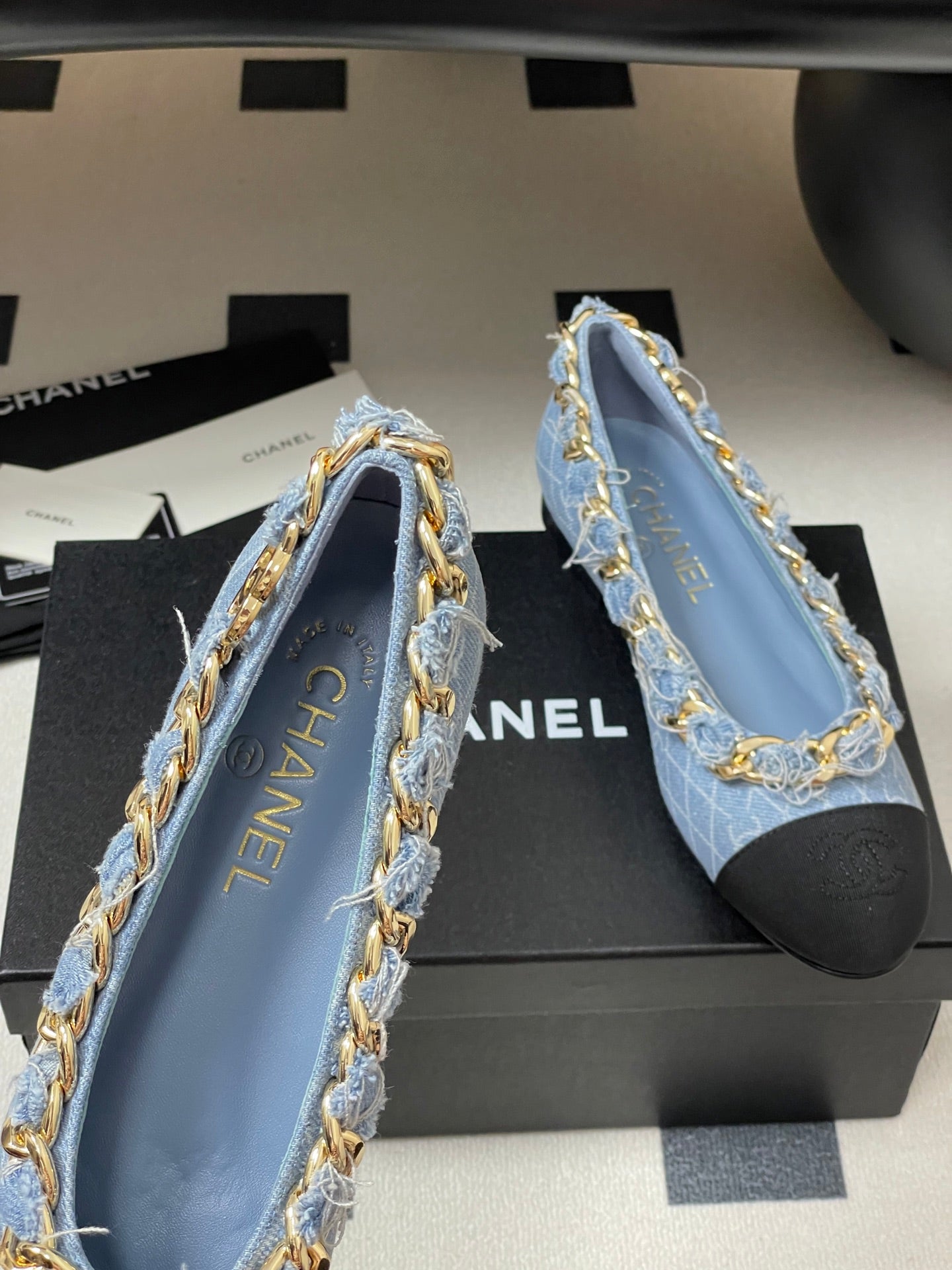 Chanel 25A Ballet Flats Big Chain Double C Blue Denim Sheepskin 393817