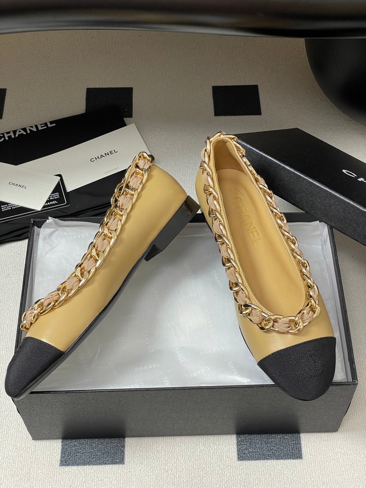 Chanel 25A Ballet Flats Big Chain Double C Beige Black Sheepskin 393818