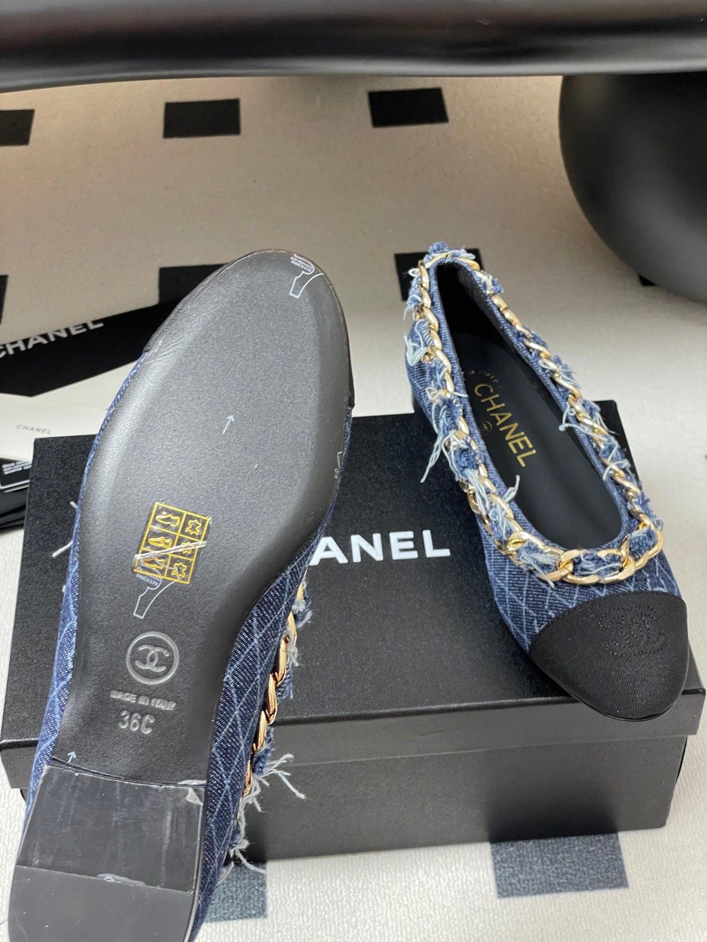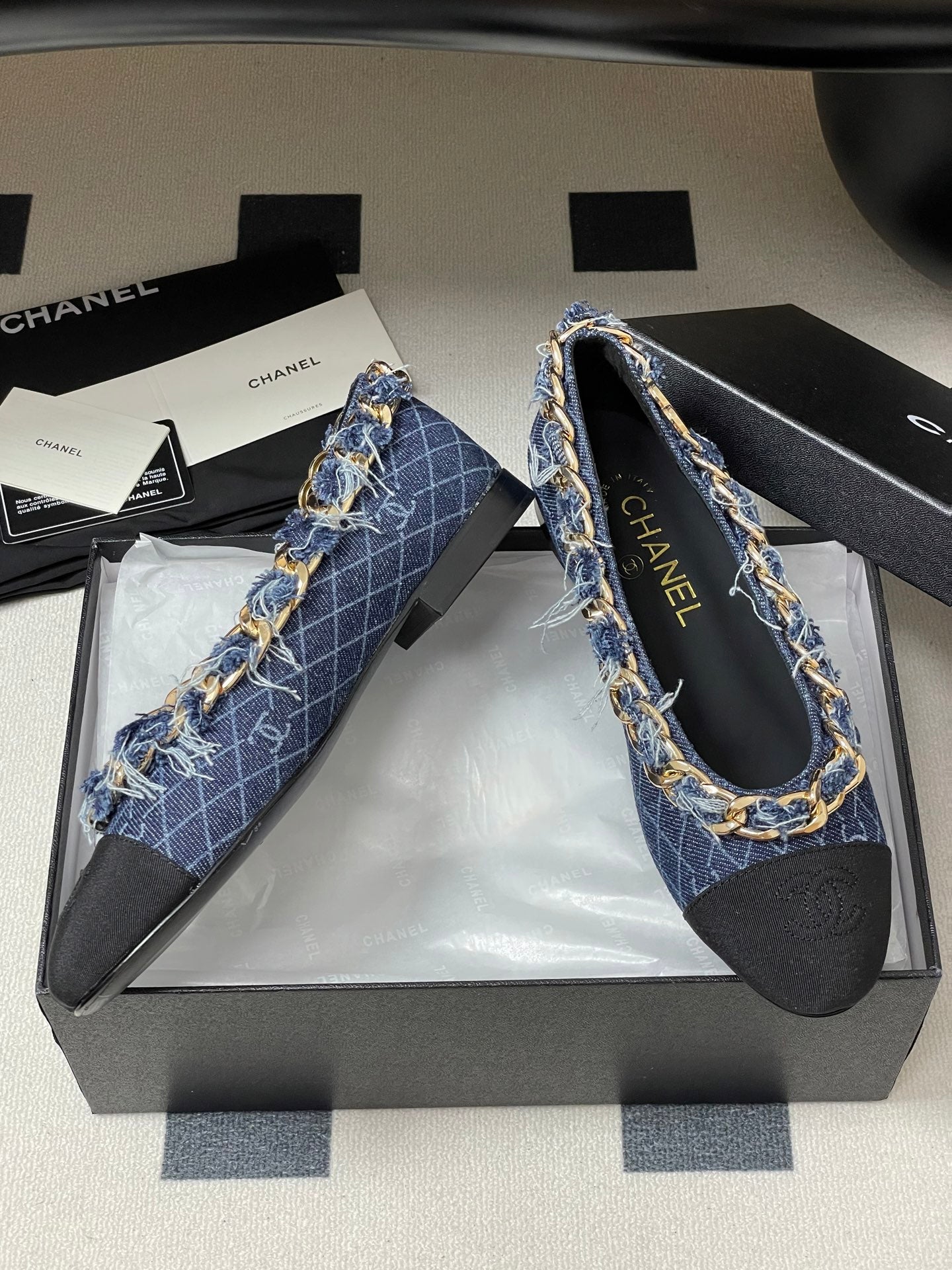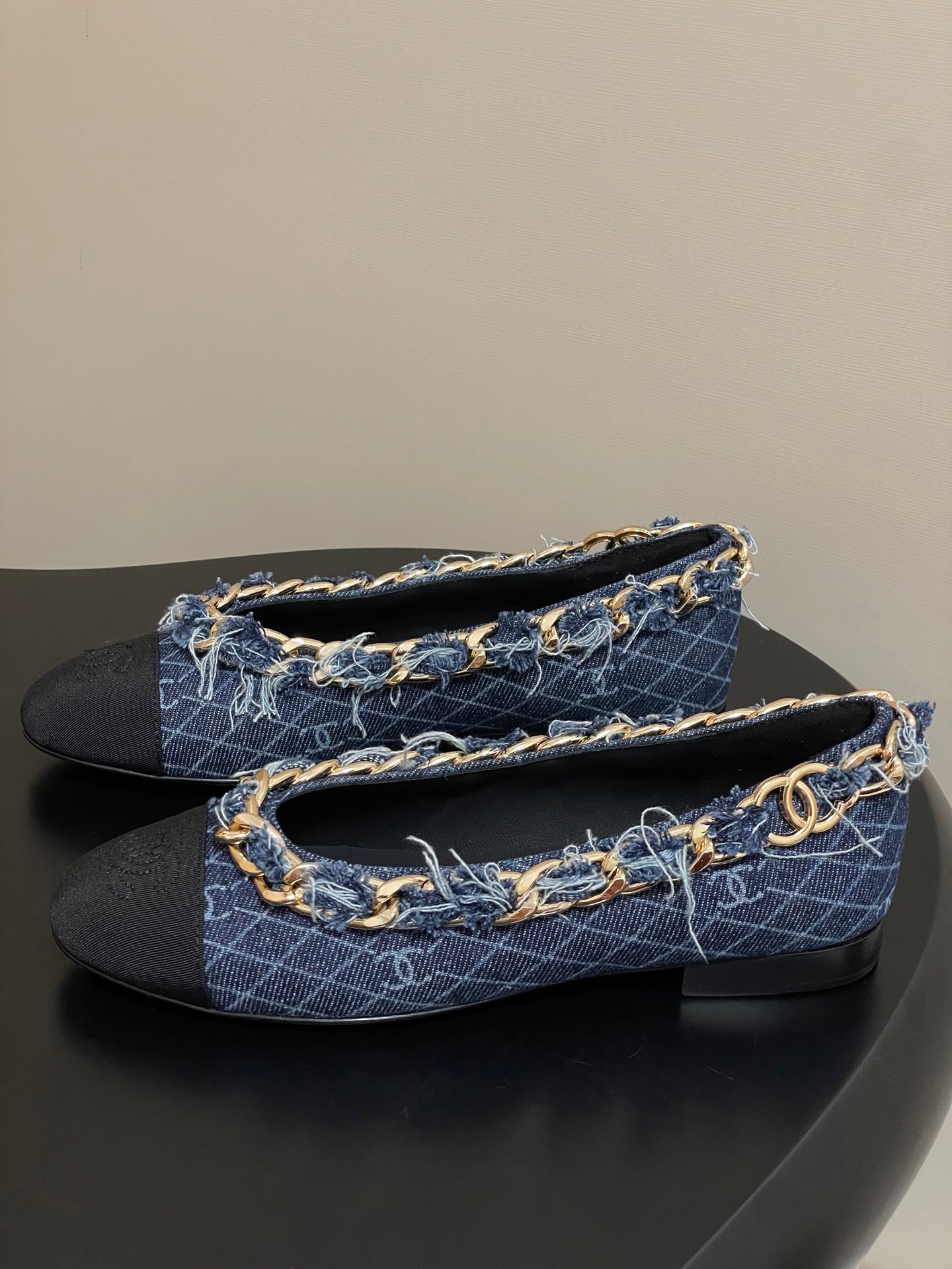 Chanel 25A Ballet Flats Big Chain Double C Dark Blue Denim Sheepskin 393816