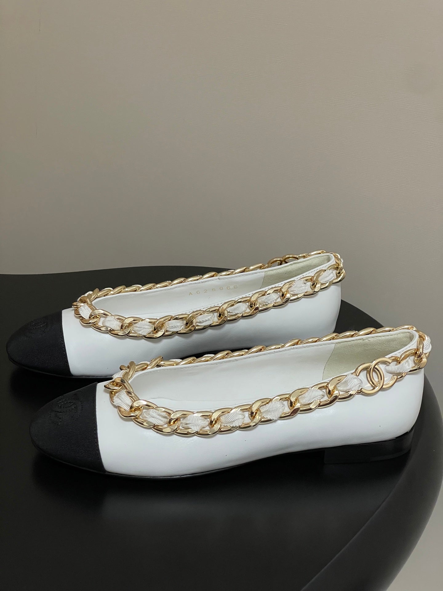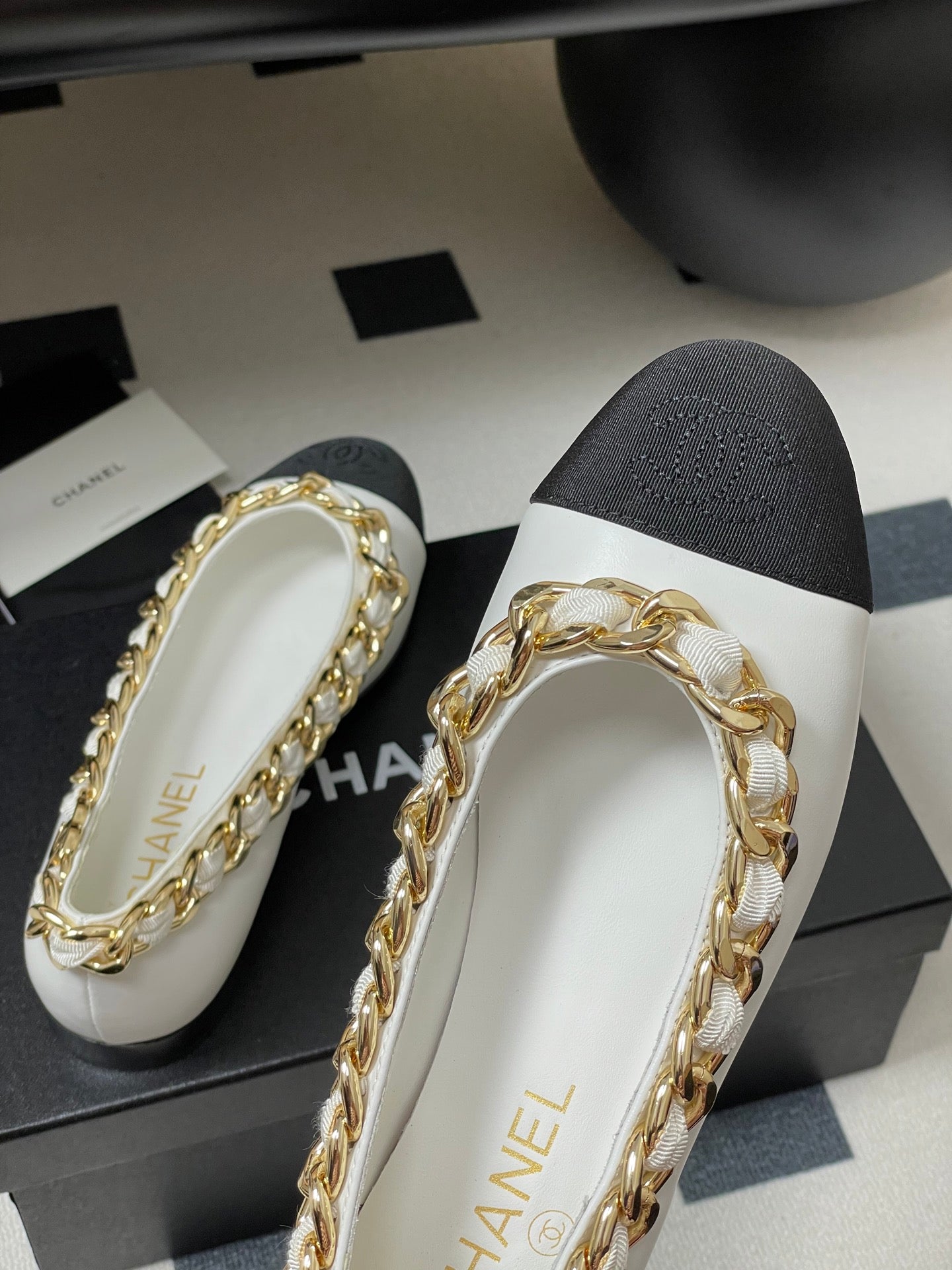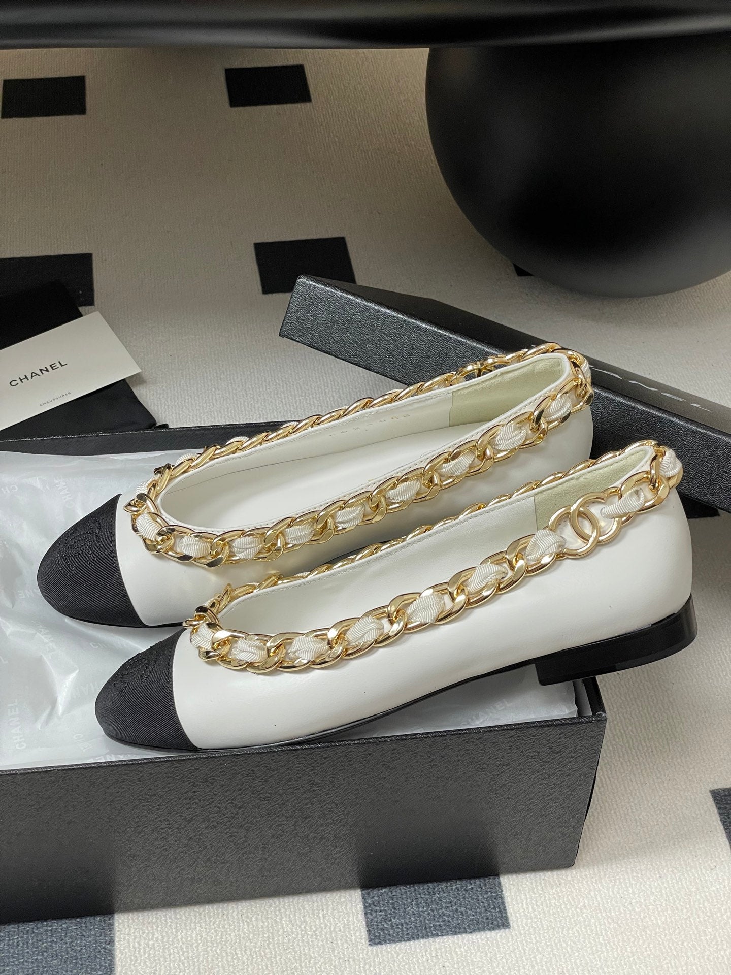 Chanel 25A Ballet Flats Big Chain Double C White Black Sheepskin 393819