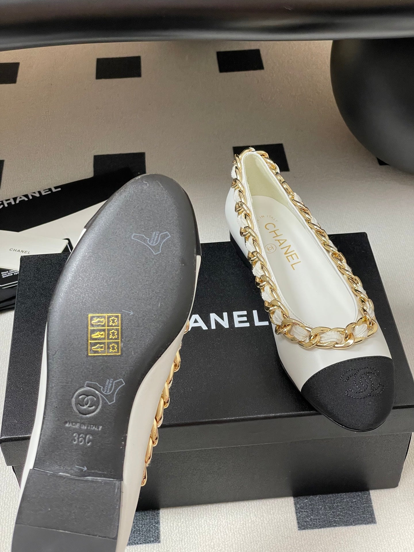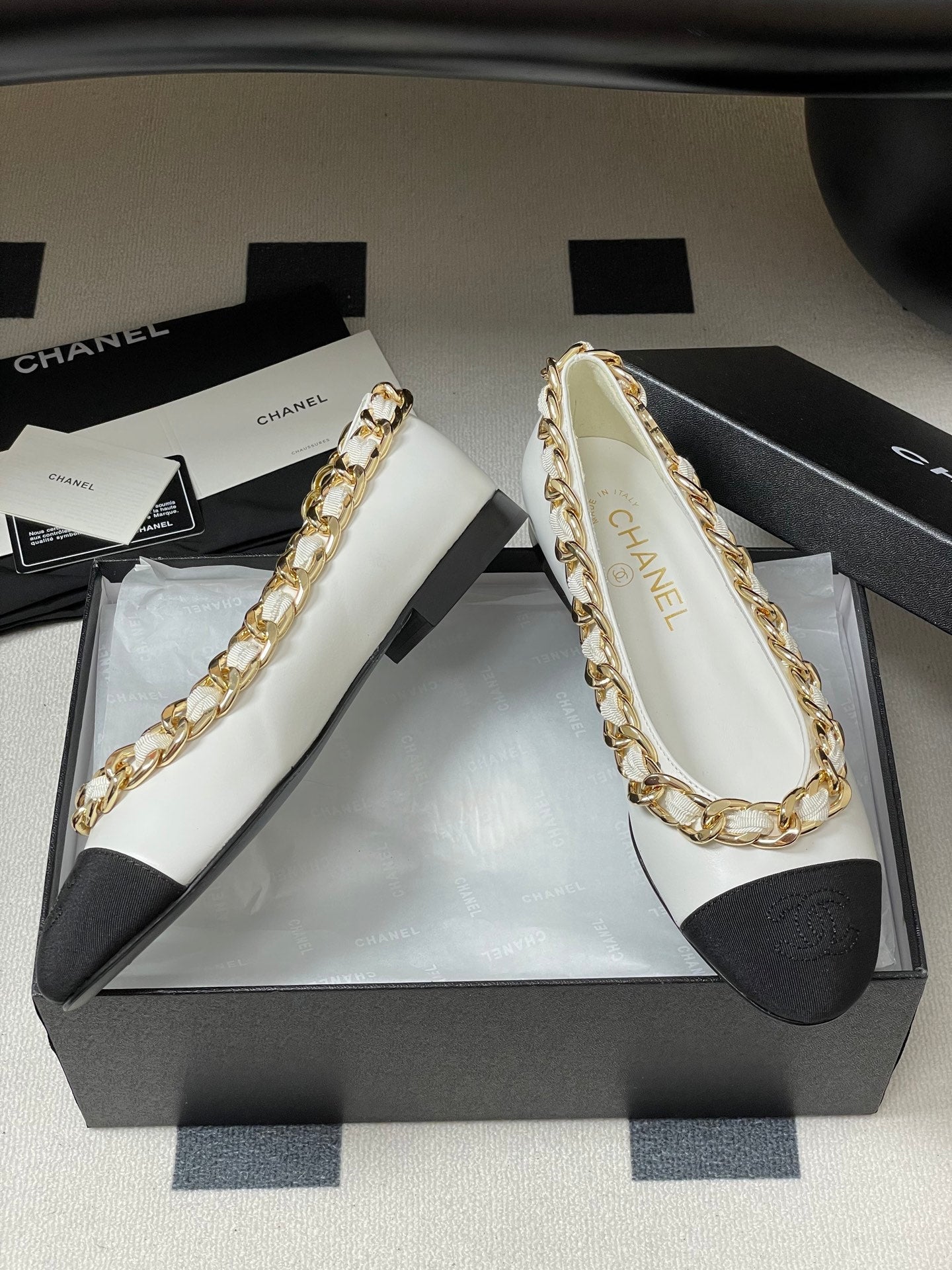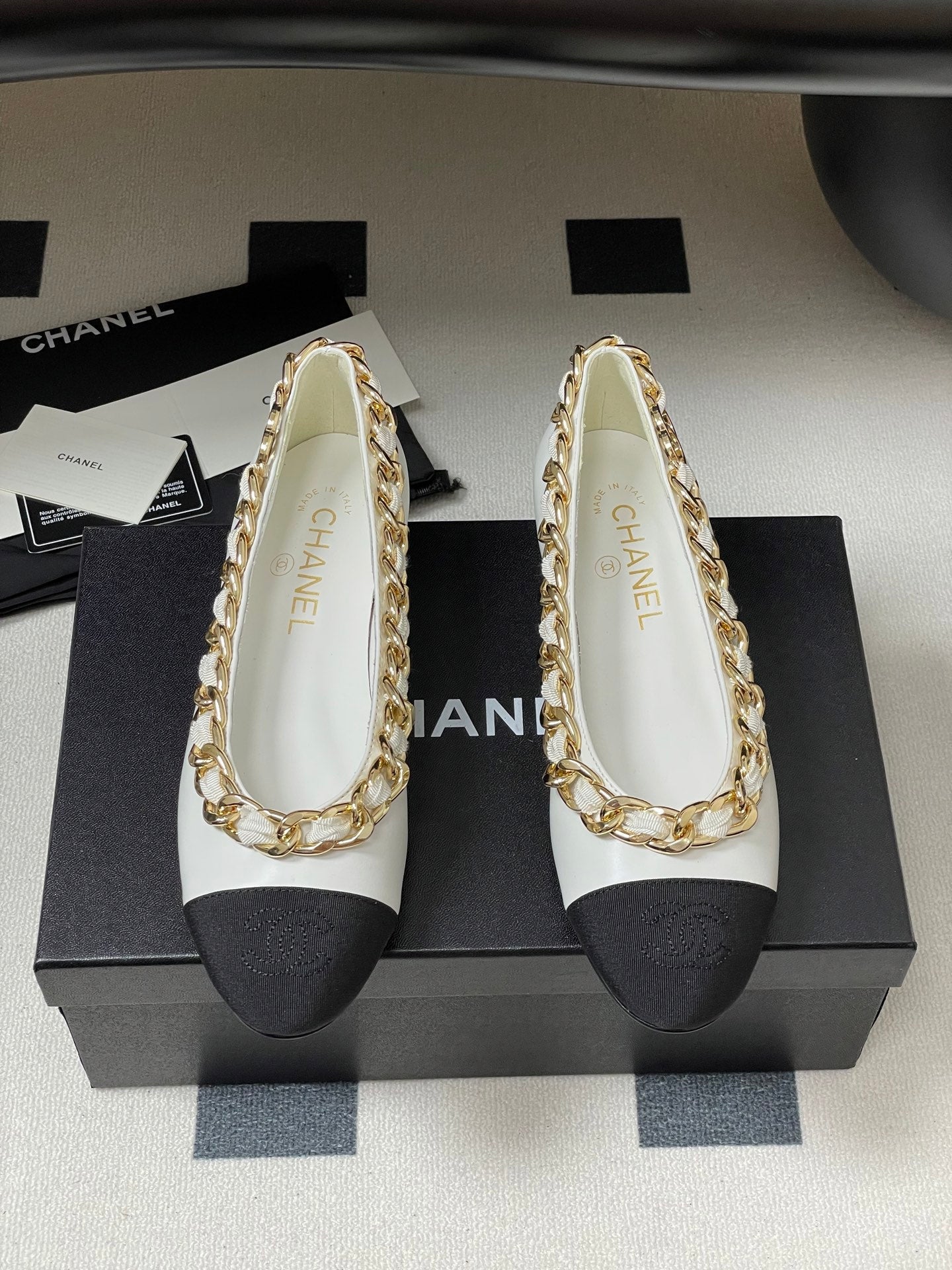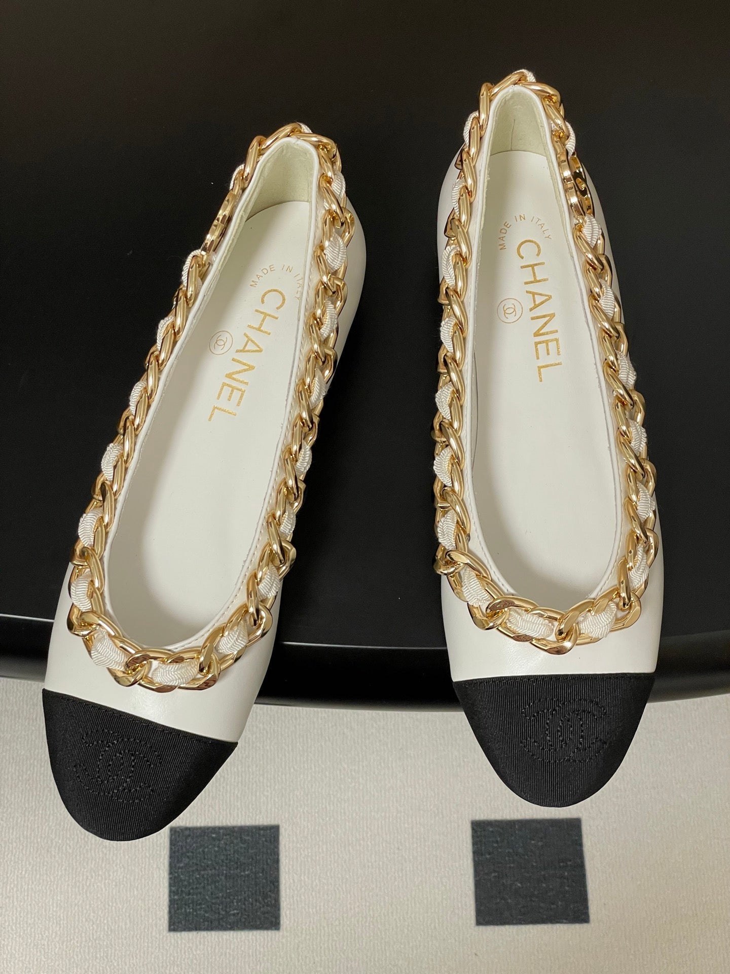 Chanel 25A Ballet Flats Big Chain Double C White Black Sheepskin 393819