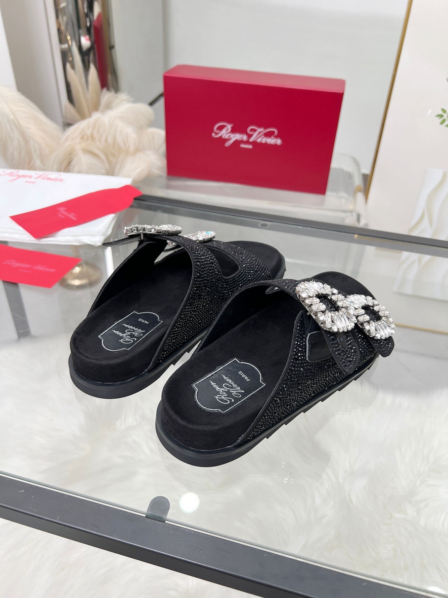 Viv 25 Slidy Diamond Slippers Black PVC Silk Cowhide 259287