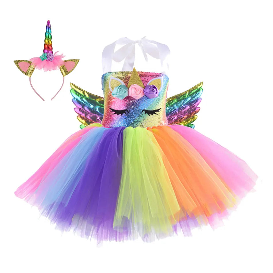 1. Unicorn Dreams: This dress is a celebration of all things magical and unicorn-inspired. The sequined bodice adds a touch of glamour, while the pastel tulle skirt gives a fairy-tale-like quality. With unicorn accents, it's a dream come true for your child.