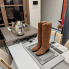 KNEE BOOTS WITH TRIANGLE LOGO IN CAMEL SUEDE