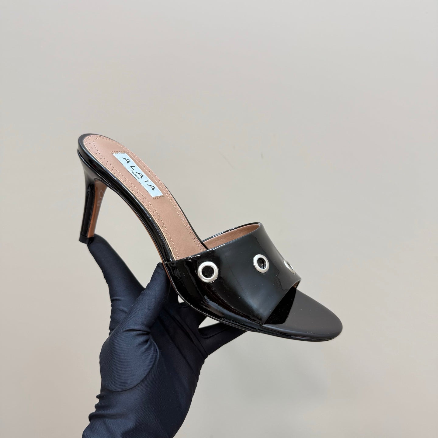 Alaia 2025 Oeillets Embellished Leather Sandals Glossy Black Lambskin 299668