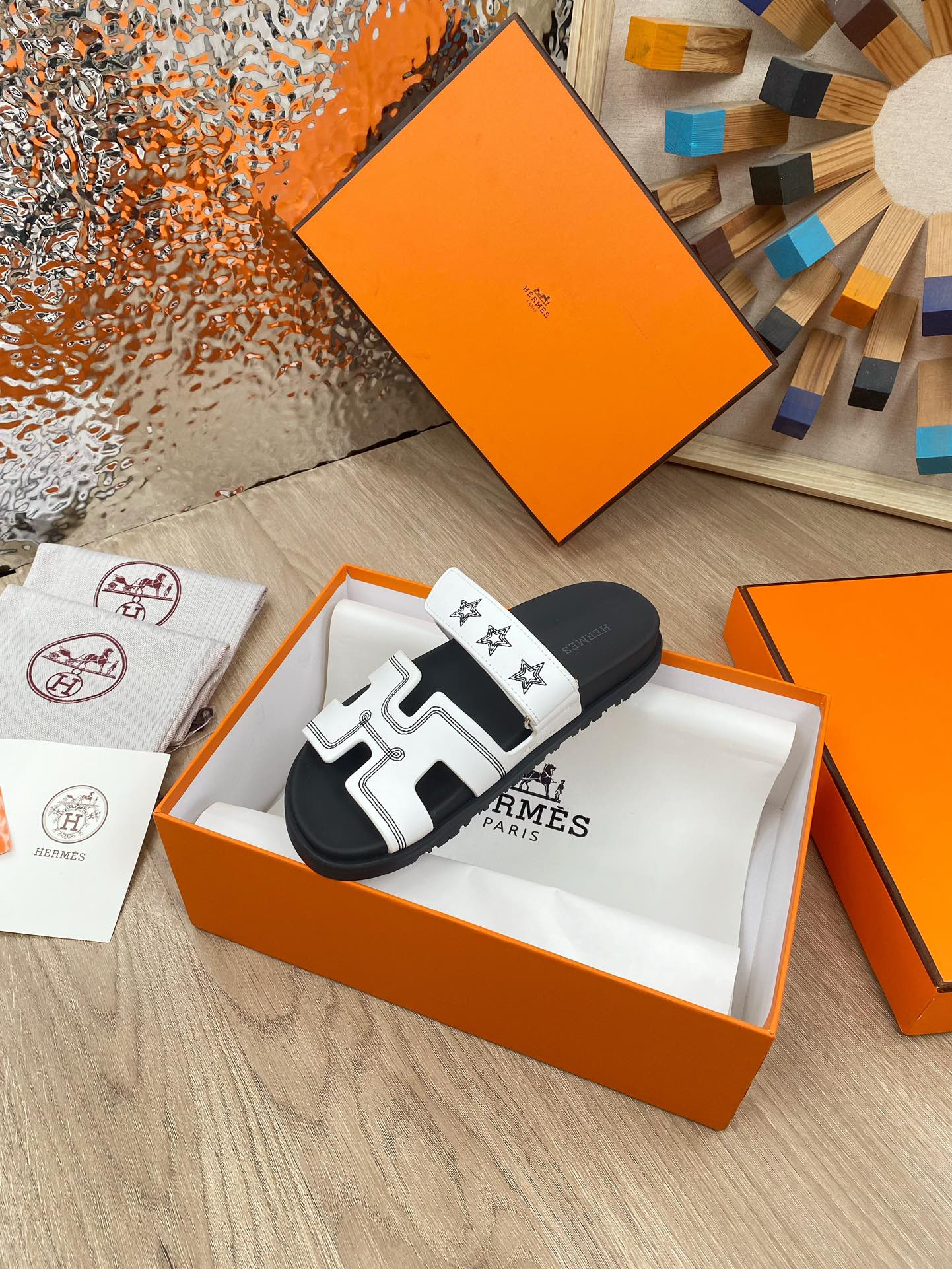 chypre sandal white black calfskin black thread embroidered
