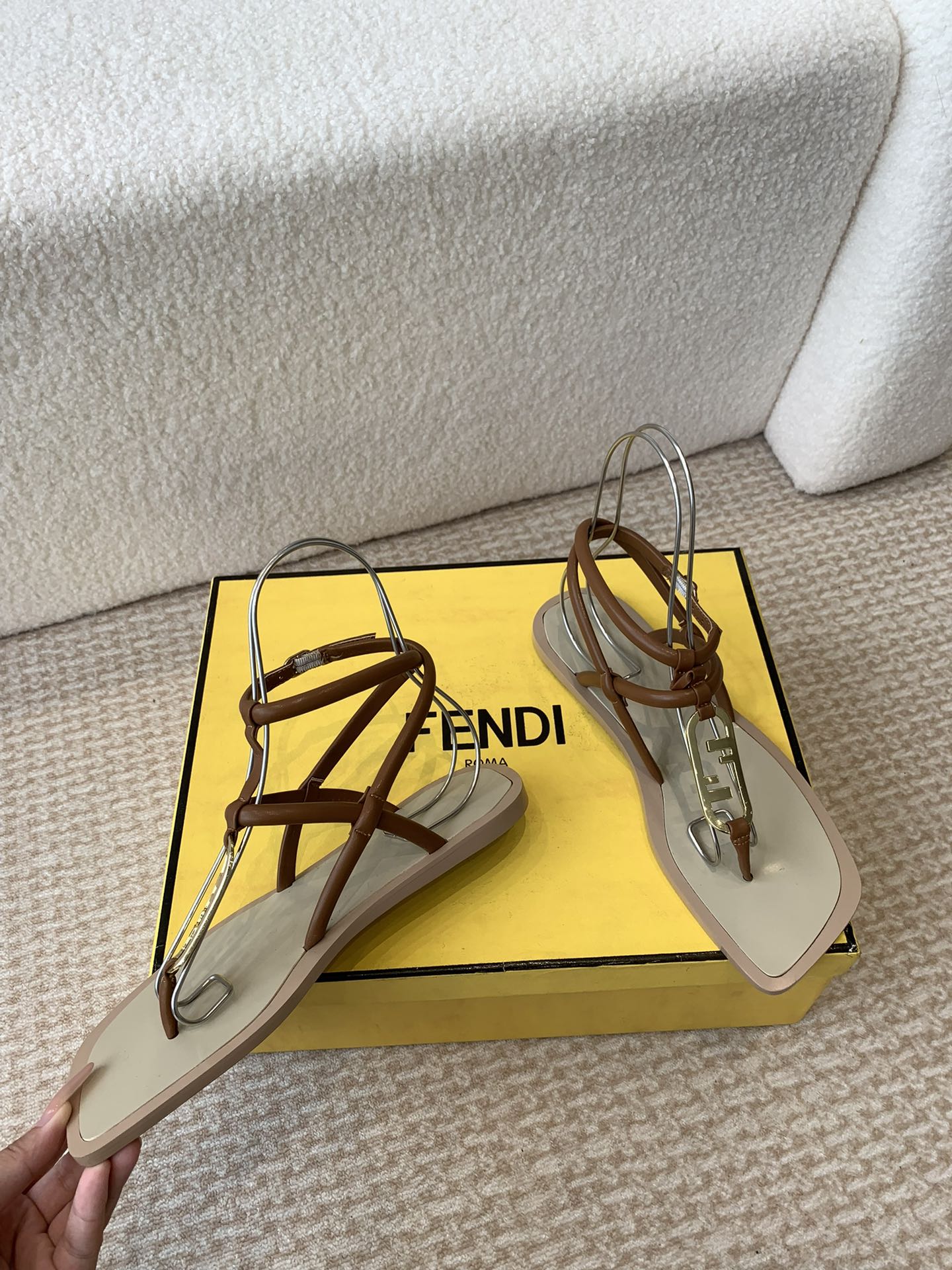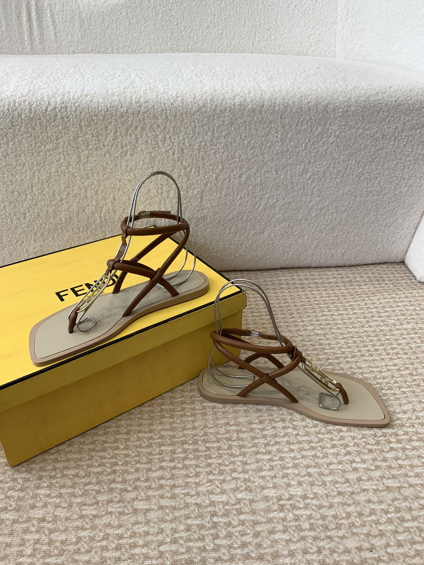 FENDI O'LOCK THONG SANDAL BROWN CALFSKIN WITH GOLD HARDWARE