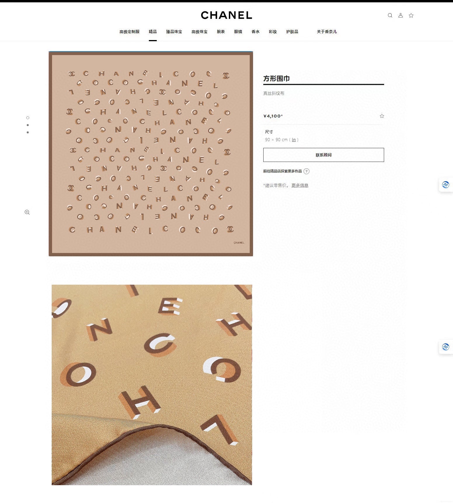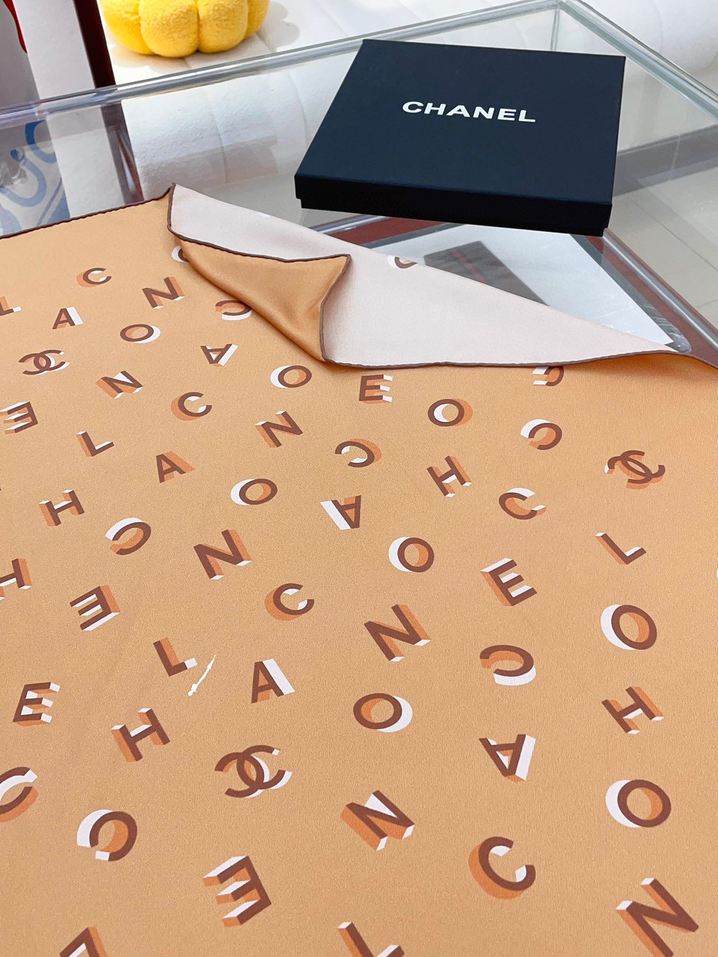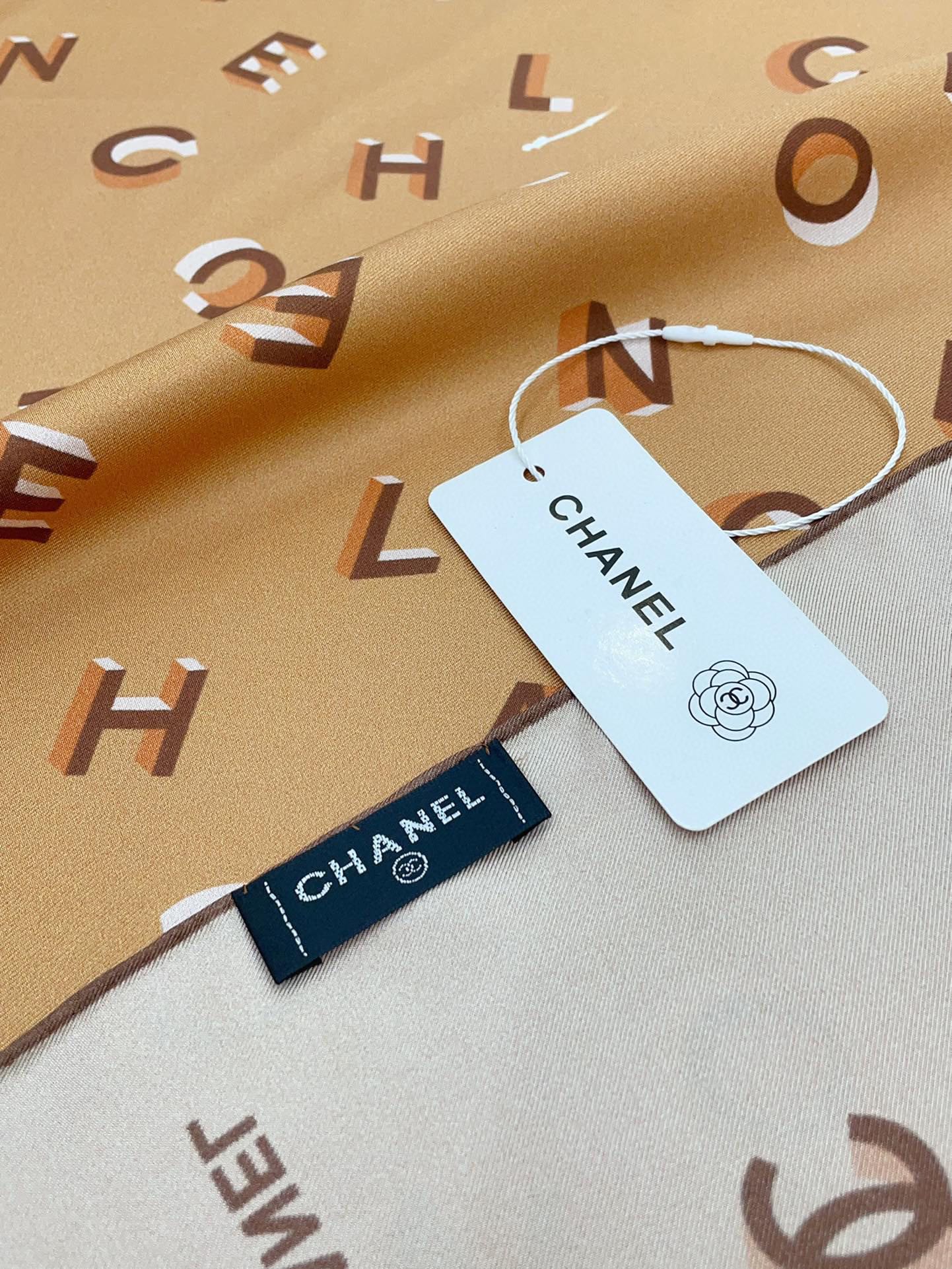 CC Square Scarf 90 CM In Dark Beige With Printed Letters Silk Twill 300436