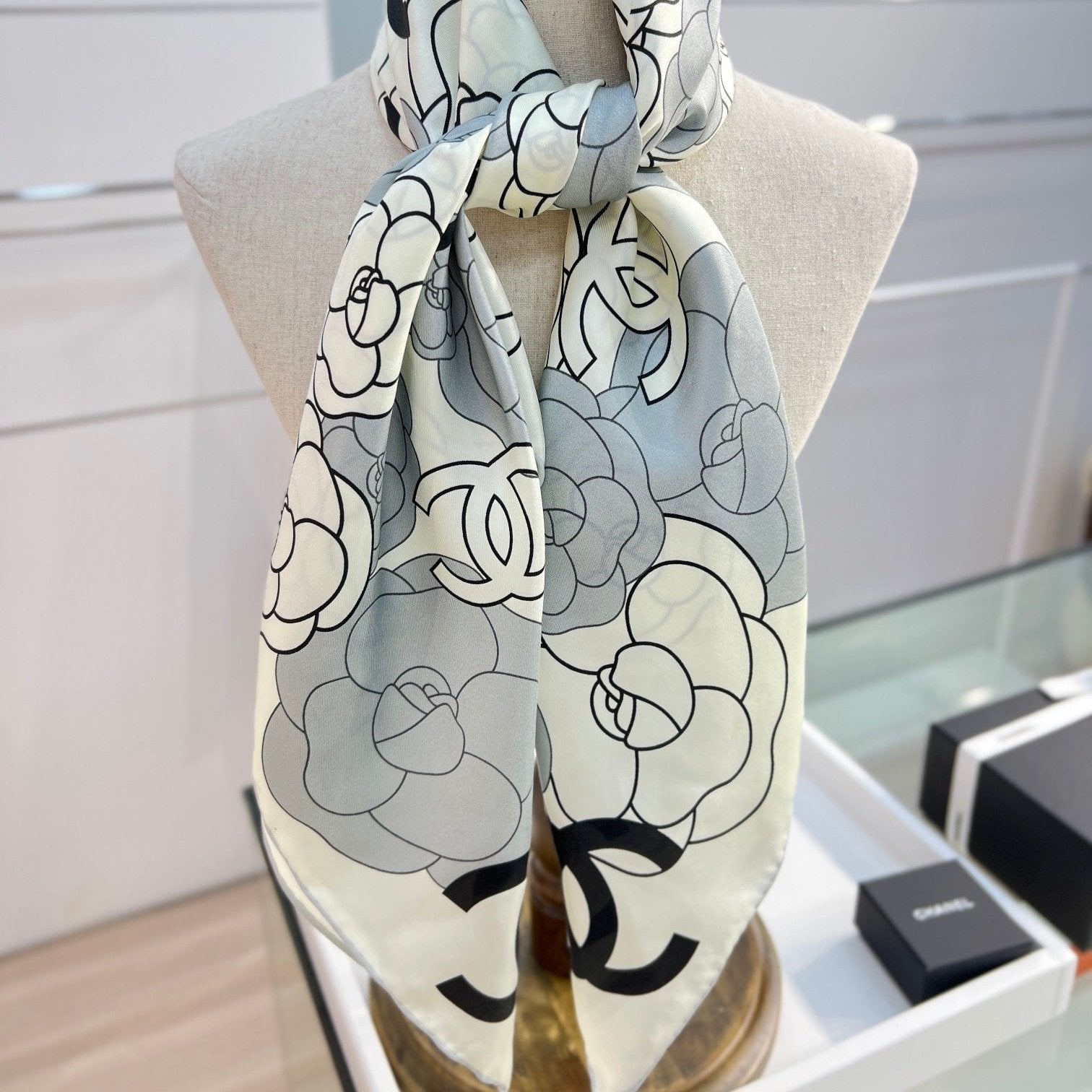 CC Square Scarf 90 CM In Grey Black And White Camellia Logo Print Silk Twill 288739
