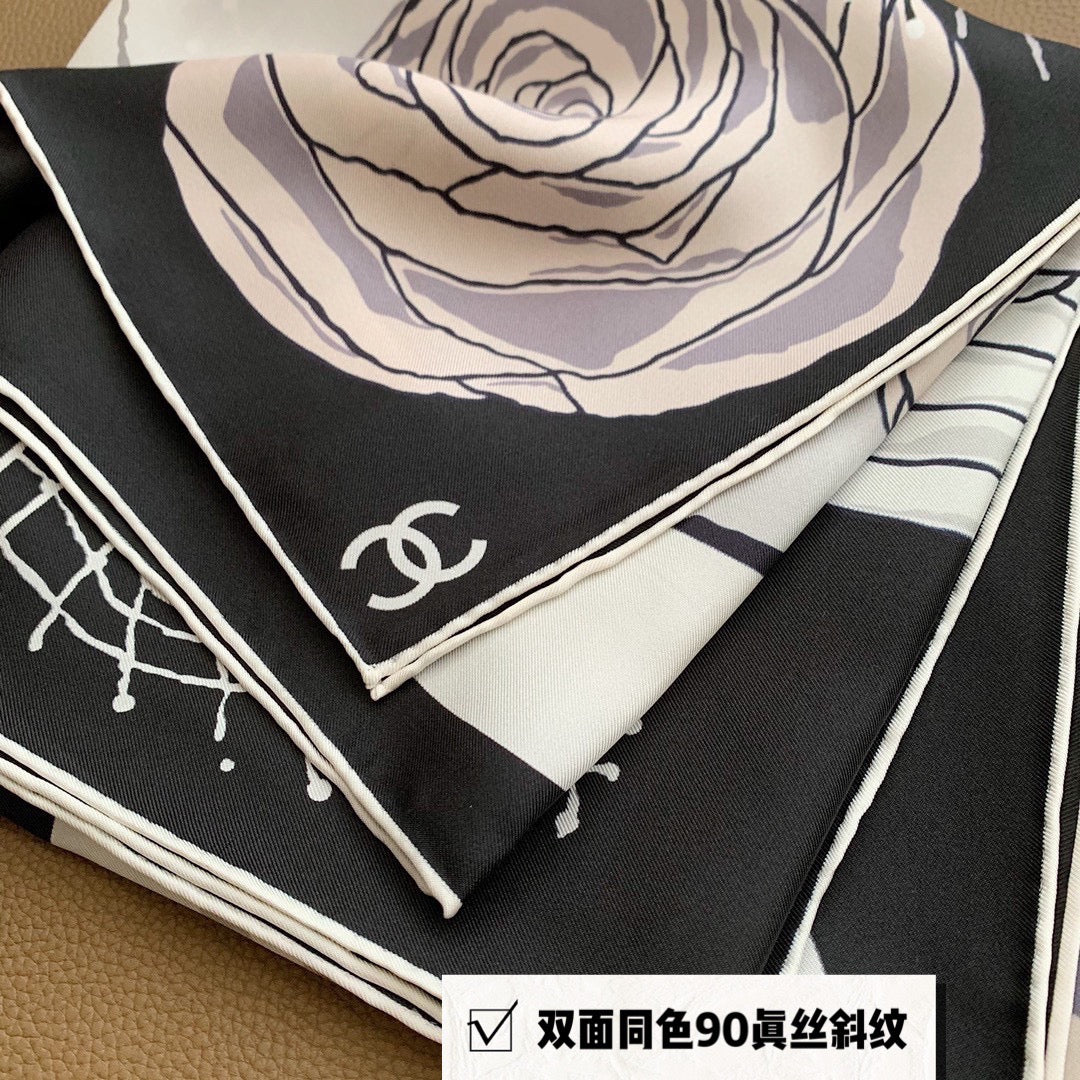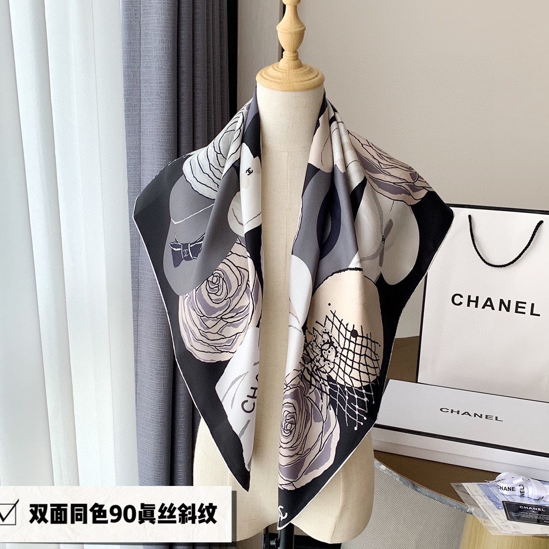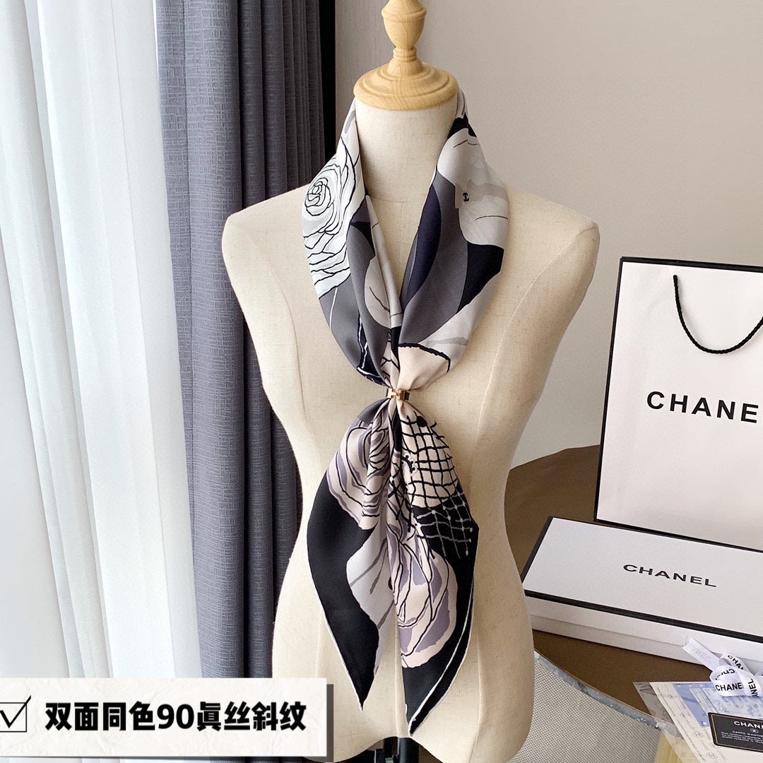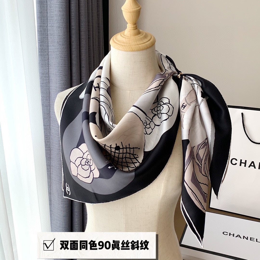 CC Square Scarf 90 CM In White Black Mix Grey Light Beige Silk 288698