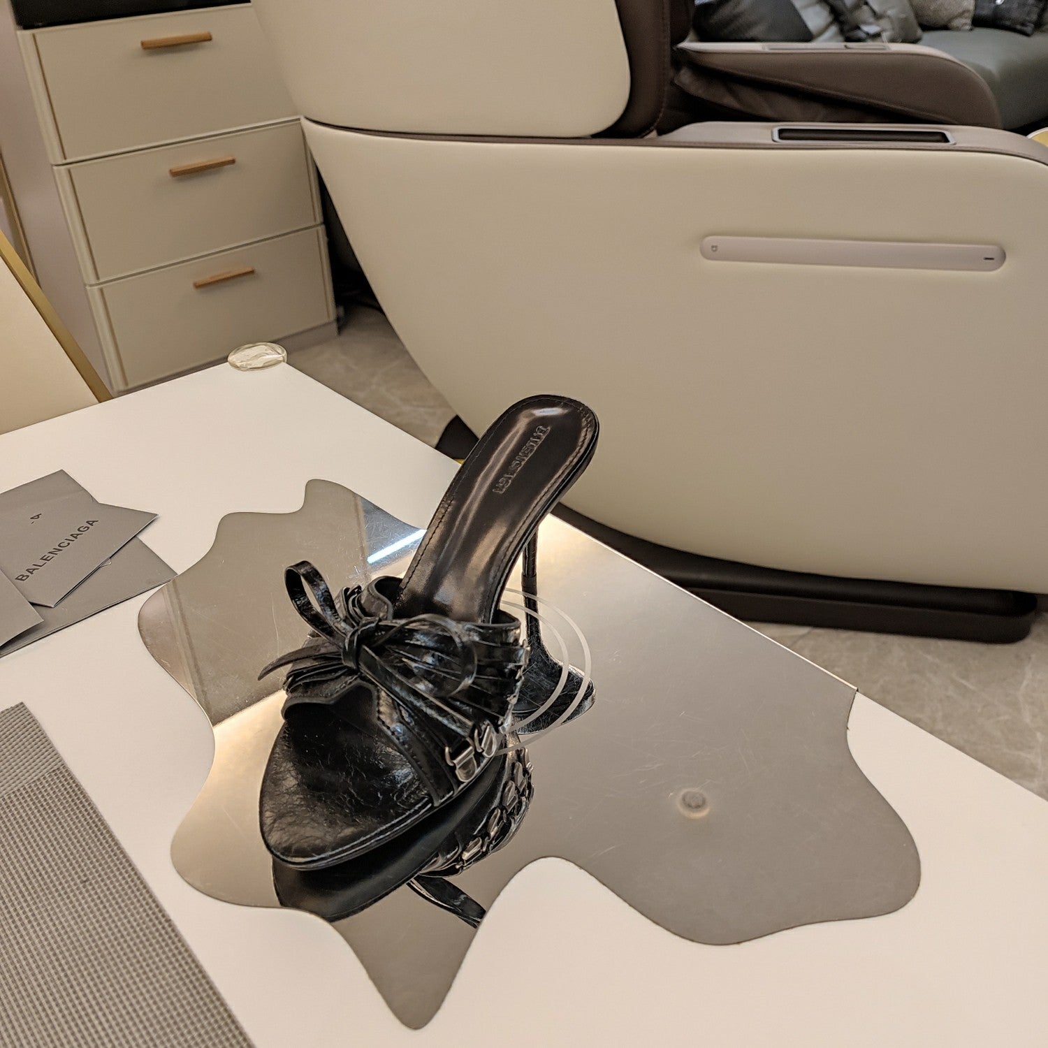 BOW-EMBELLISHED HIGH MULES IN BLACK SHEEPSKIN