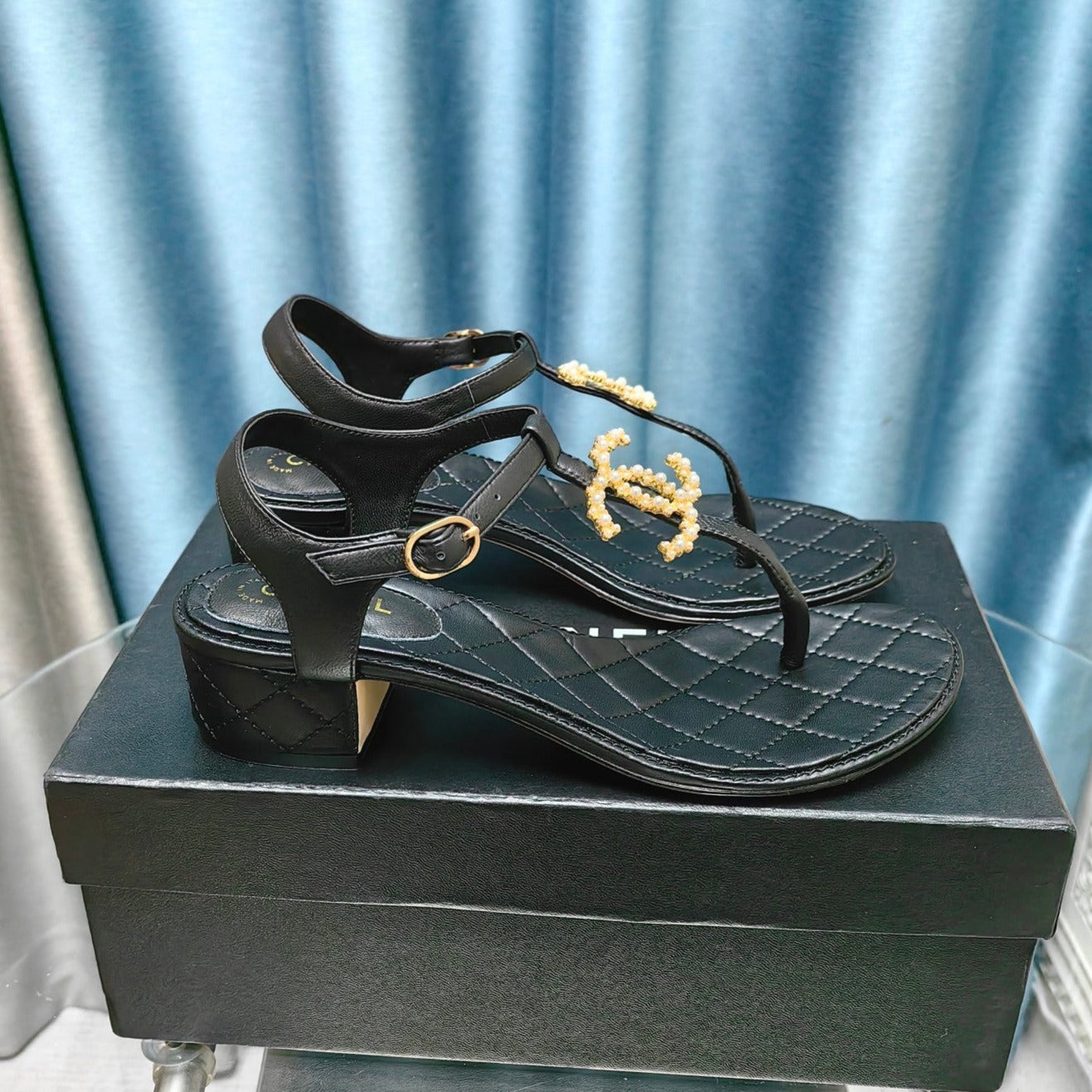 cc thong sandal 40 black calfskin gold cc logo