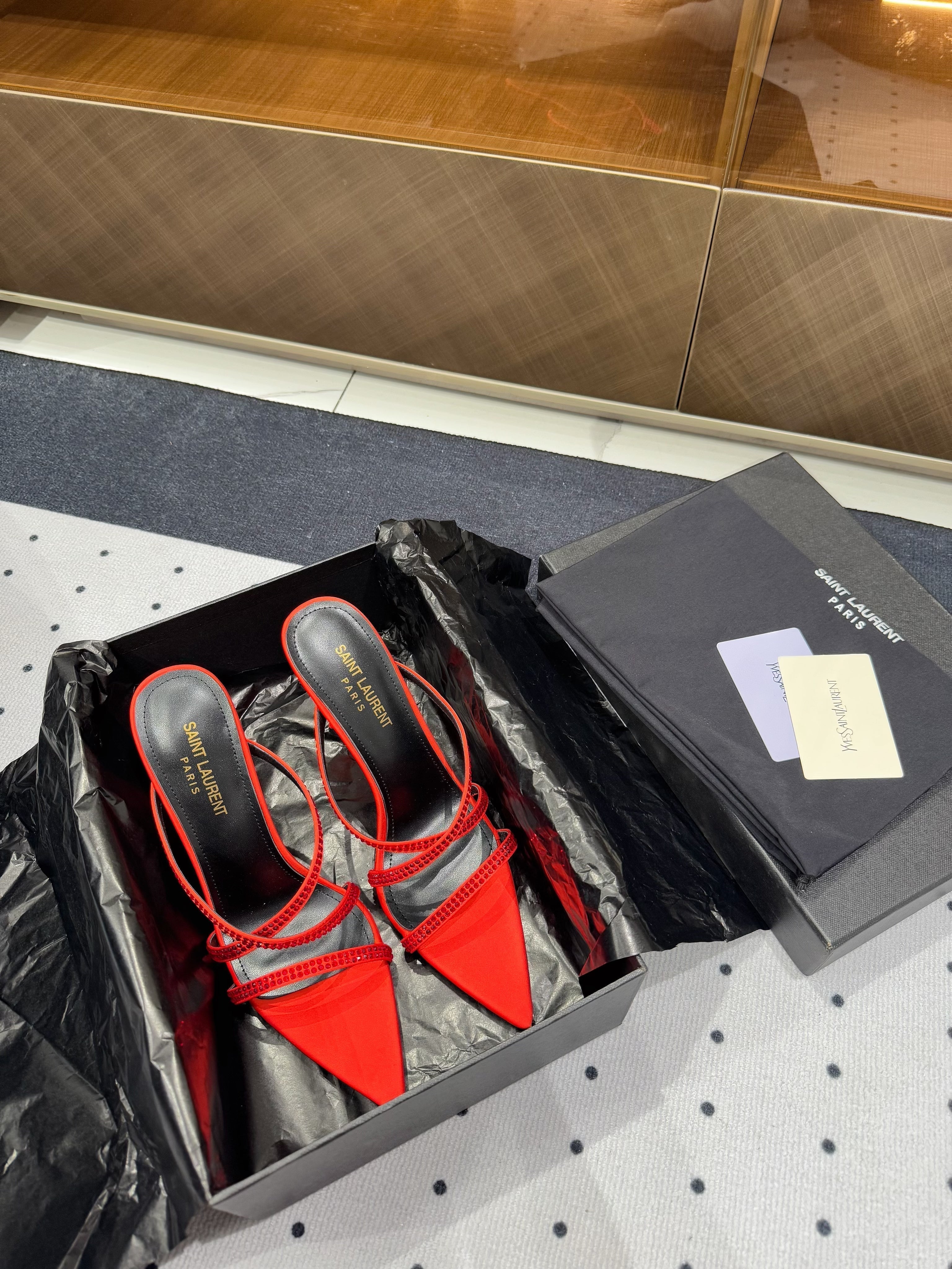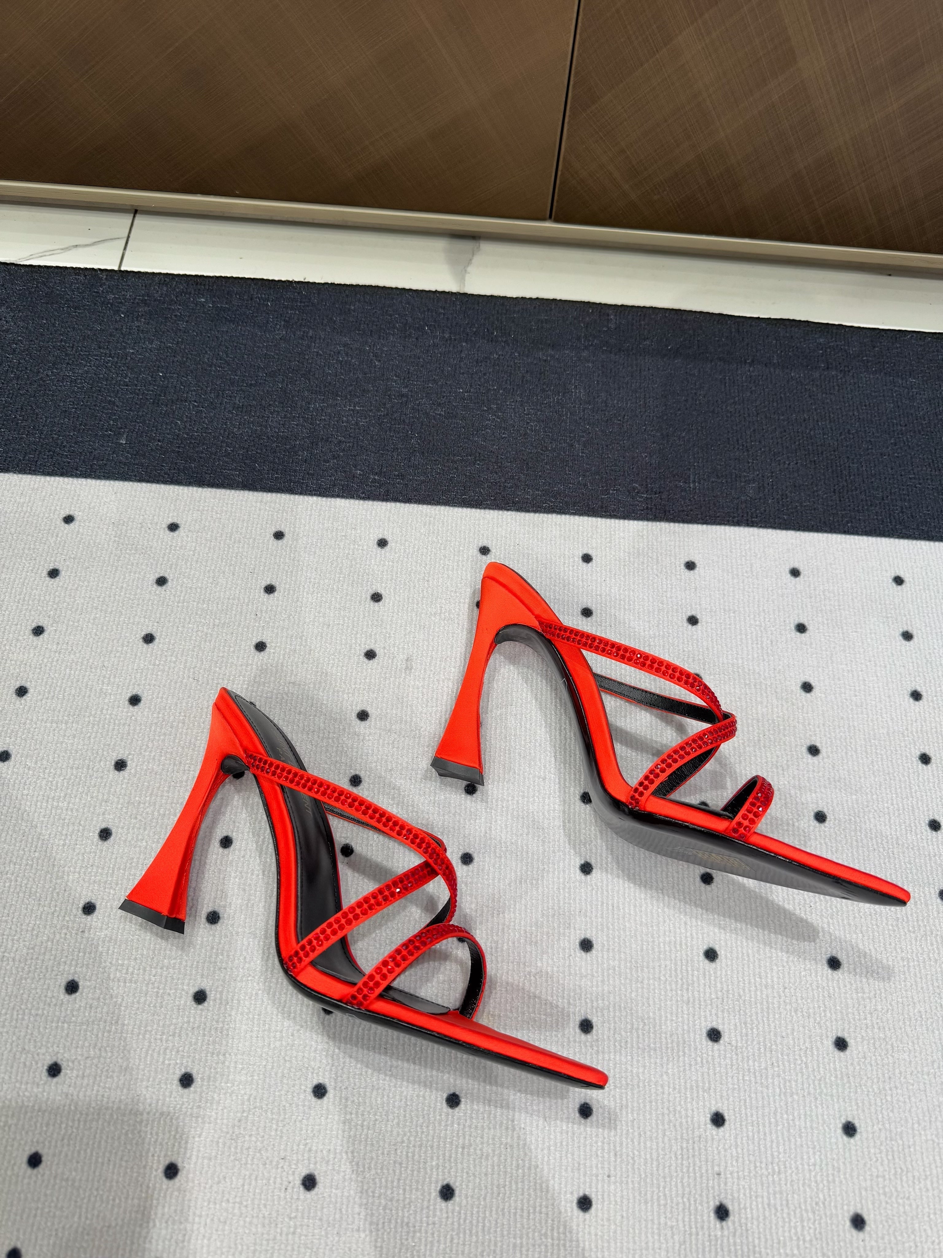 HIGH CRYSTAL STRAP SANDALS IN RED SILK