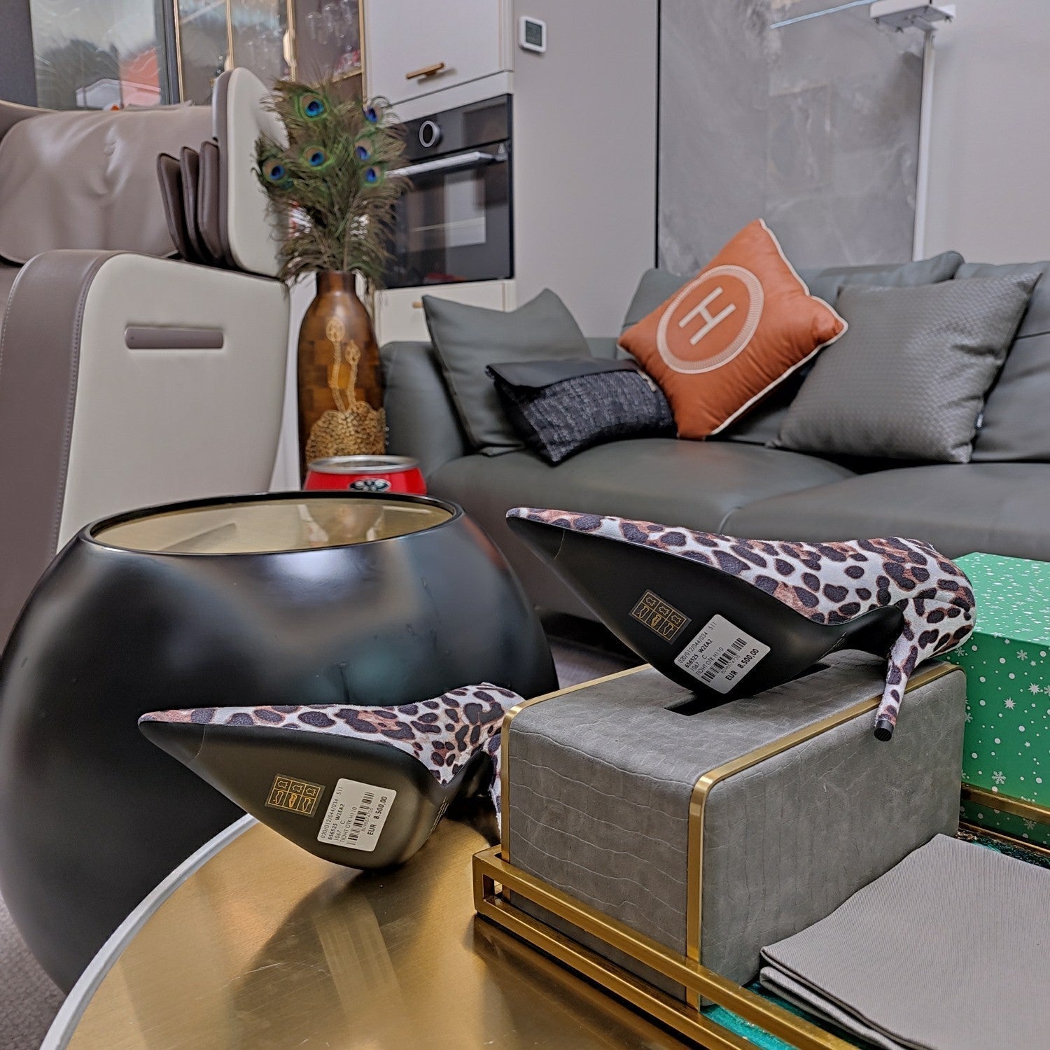 HIGH PUMPS IN LIGHT GRAY LEOPARD PRINT SUEDE