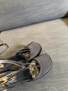 LA SCANDALE PLATFORM SANDALS IN TAUPE BROWN SATIN